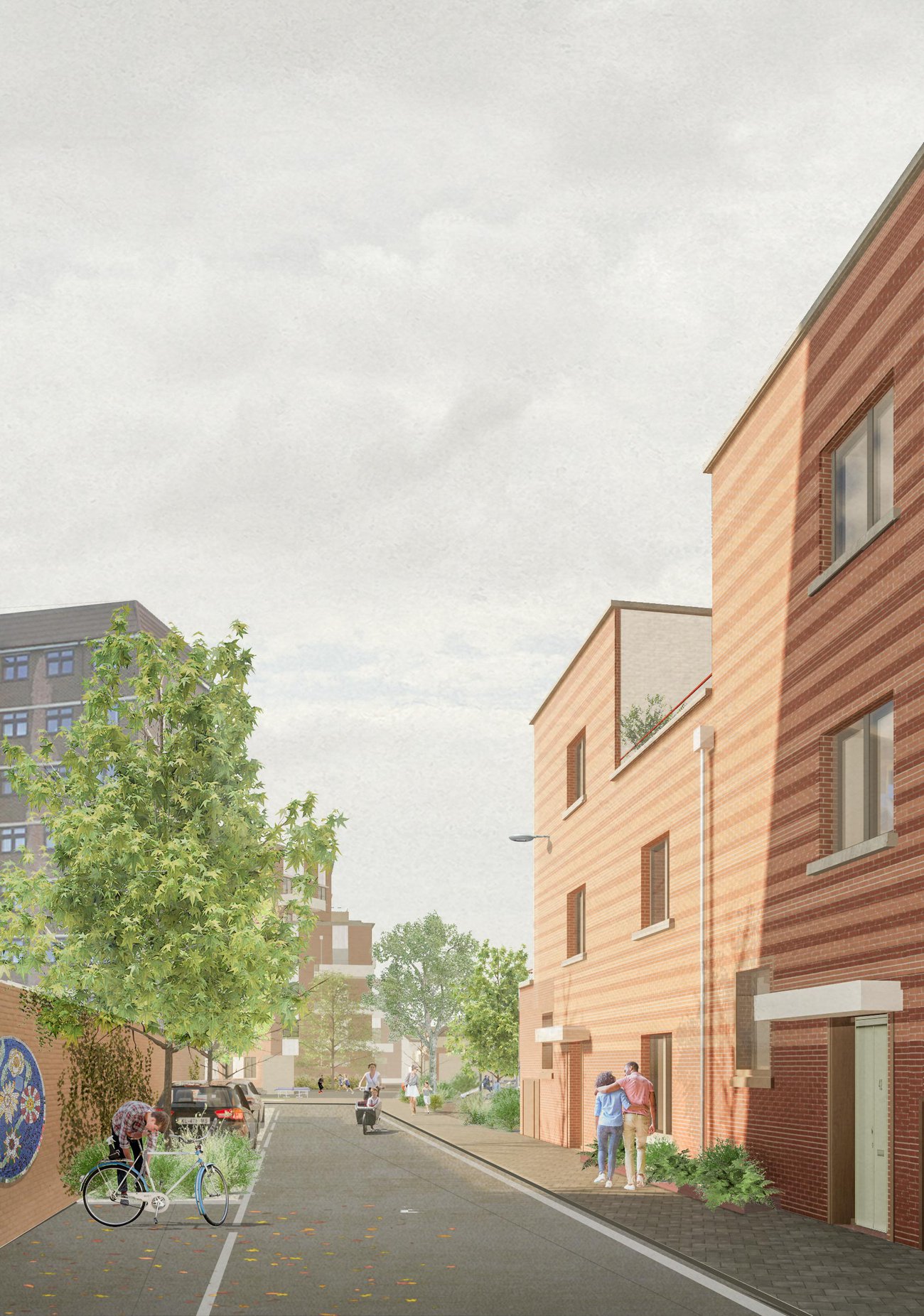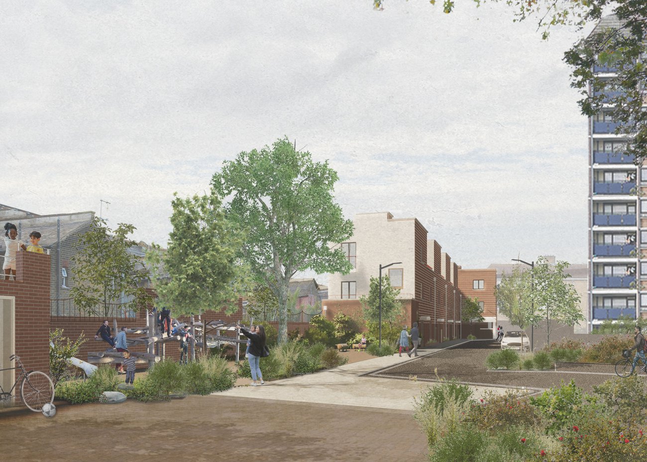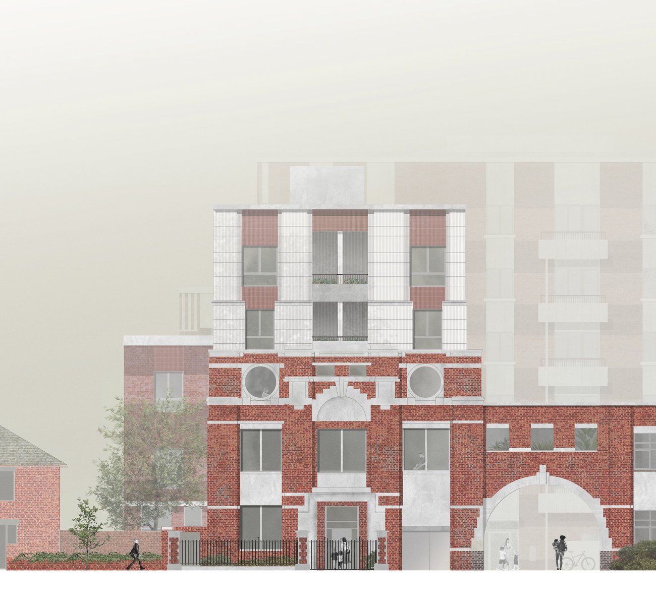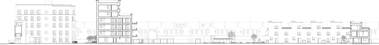 The project repurposes and extends the historic building for new homes, with the circular windows and extra tall ceiling heights providing spacious and exciting new socially rented flats. Through the retained arch, a new series of buildings and playable landscapes connect to the 1950s estate, activating the former backland and making new pedestrian routes. A new building frames the central yard, with front doors, windows and balconies to provide a sense of liveliness, and leads through to the neighbourhood yard, with secure bike parking, new communal play, and biodiverse shrubs and trees. Taking care to maintain and improve sunlight to existing and new garden spaces, a castellated row of new houses form the southern boundary with front doors lining a new quiet residential street repairing and joining the once dead end estate roads. A palette of brick and fluted precast concrete takes reference from the historic façade and gable ends of the estate blocks, tying the whole ensemble together.