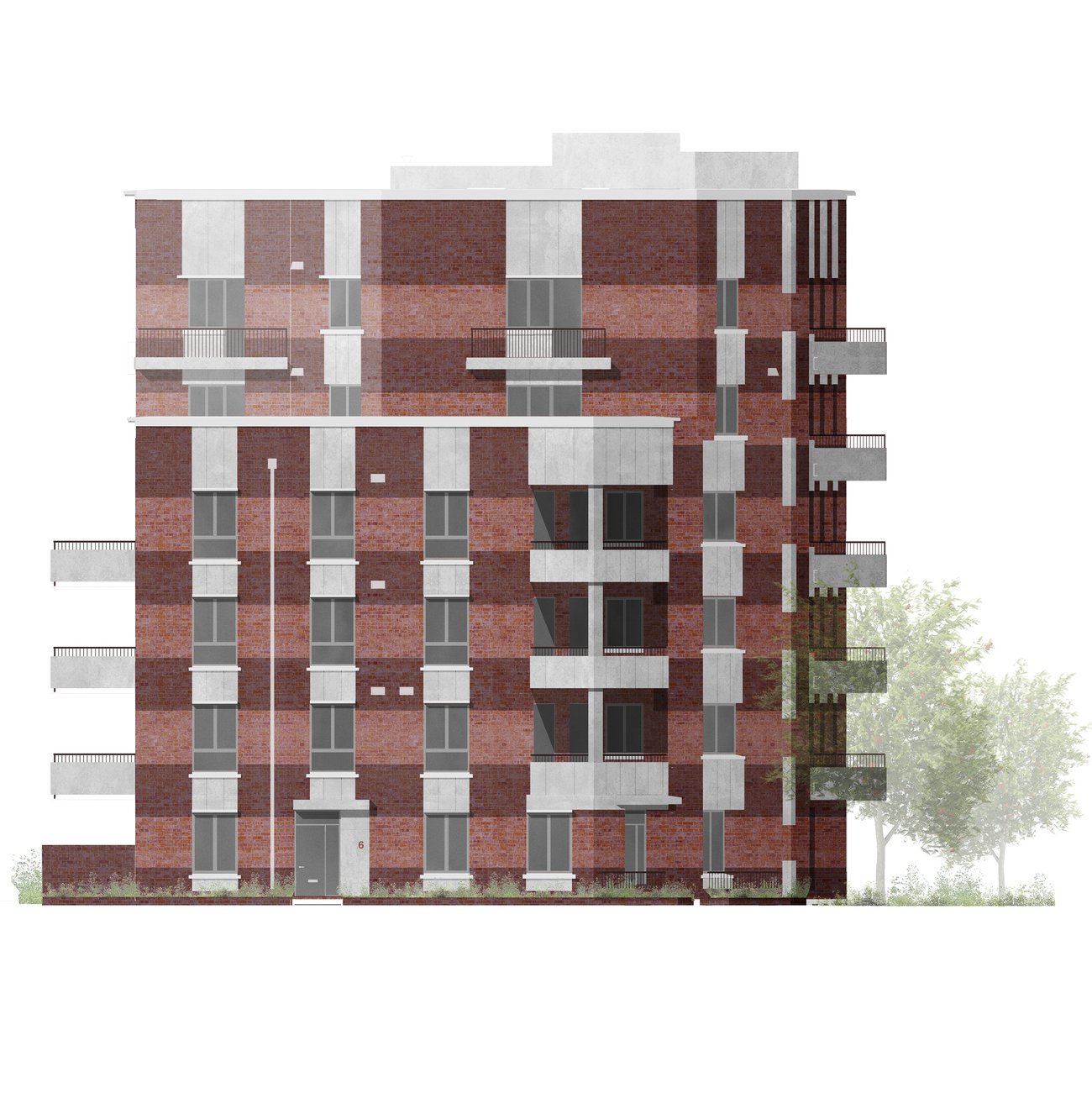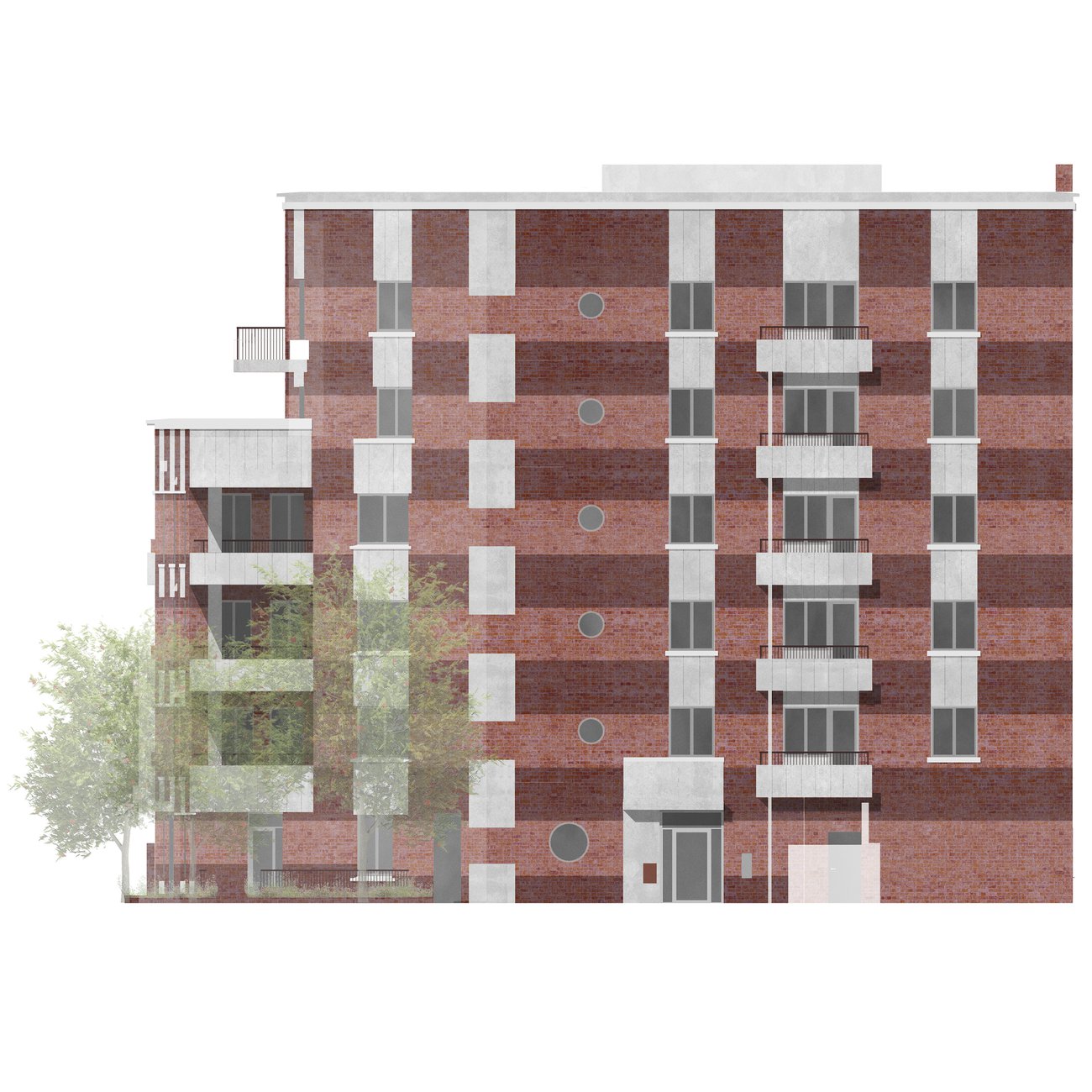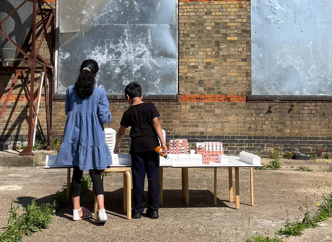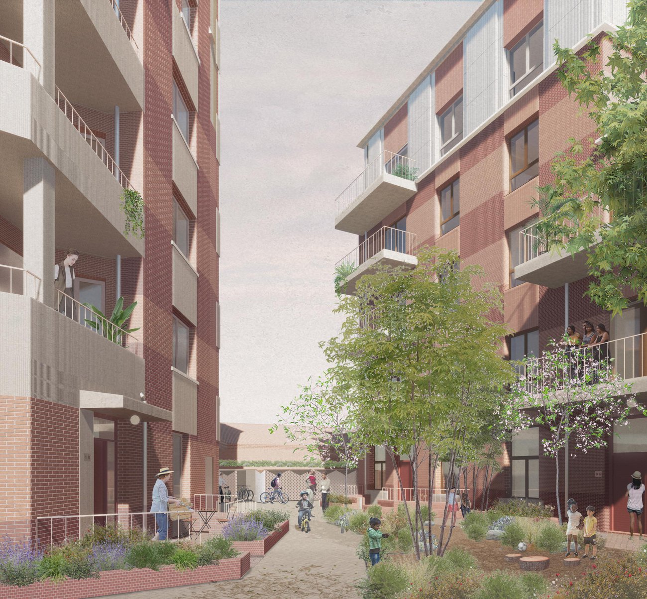 The project repurposes and extends the historic building for new homes, with the circular windows and extra tall ceiling heights providing spacious and exciting new socially rented flats. Through the retained arch, a new series of buildings and playable landscapes connect to the 1950s estate, activating the former backland and making new pedestrian routes. A new building frames the central yard, with front doors, windows and balconies to provide a sense of liveliness, and leads through to the neighbourhood yard, with secure bike parking, new communal play, and biodiverse shrubs and trees. Taking care to maintain and improve sunlight to existing and new garden spaces, a castellated row of new houses form the southern boundary with front doors lining a new quiet residential street repairing and joining the once dead end estate roads. A palette of brick and fluted precast concrete takes reference from the historic façade and gable ends of the estate blocks, tying the whole ensemble together.