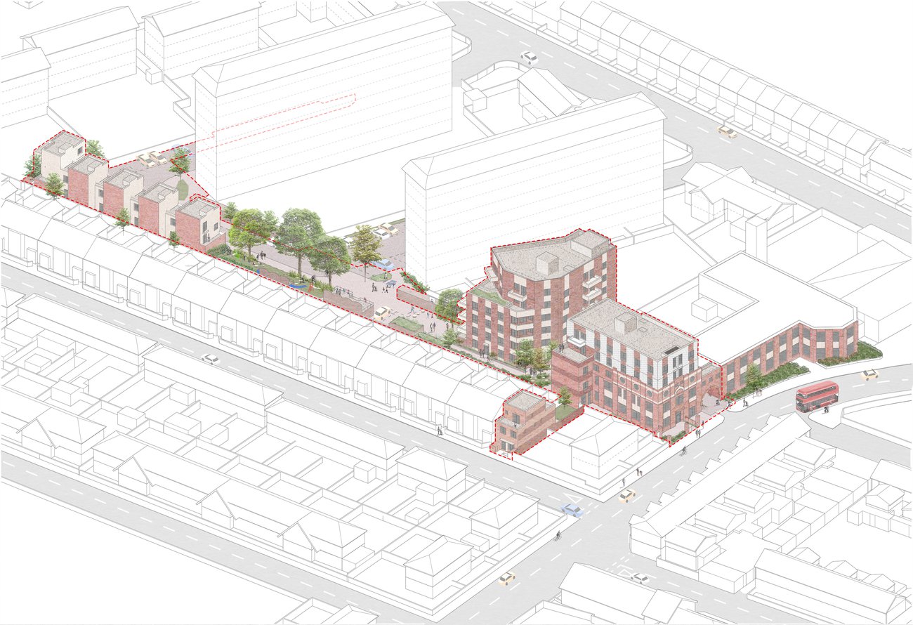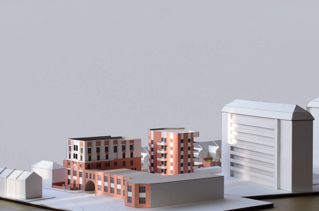 A series of buildings and public realm on the edges of a 1950s estate, providing 48 new socially rented homes including retention of historic depot facade and archway
