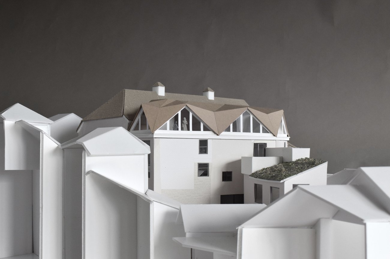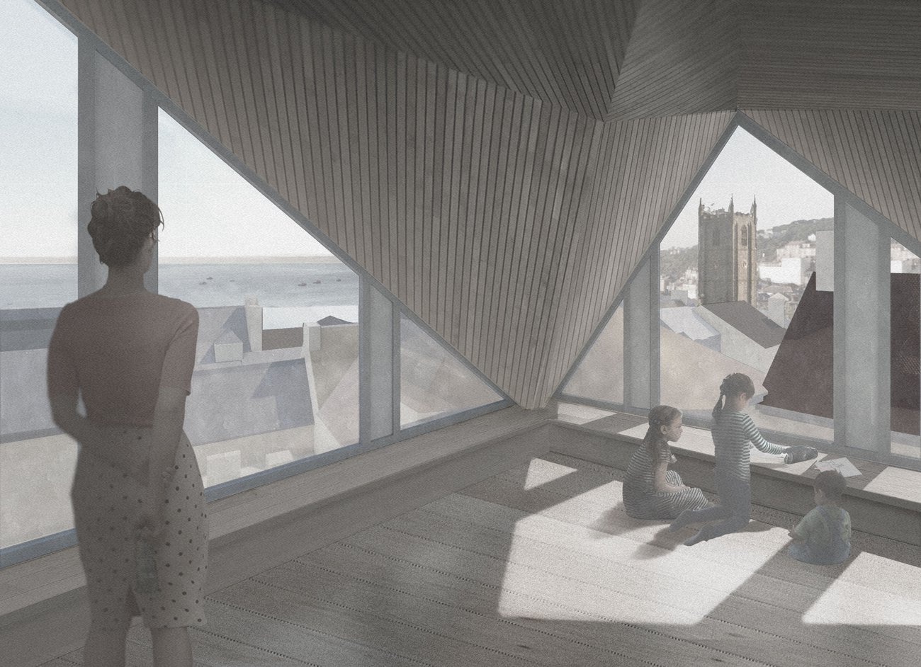 The Palais de Danse is a former cinema, dance hall and workshop in the centre of St Ives, which was used as a studio by Barbara Hepworth in the 1960s. After 50 years of dances, the Palais de Danse was purchased by Hepworth to expand the scale of her sculptures. Here she made large scale armatures and maquettes for major works such as Winged Figure, now on Oxford Street, London, and Single Form at the UN Headquarters in New York. The Palais sits on the harbour facing hill, with cave like workshop spaces, to reopen as part of the Barbara Hepworth Museum, and above the 20m long maple sprung dance floor and adjacent small hall, to become new learning, performing and gathering spaces. Working with the St Ives roofscape, an attic extension provides level access to the dancehall’s balcony and former projection rooms and new public spaces with views out to the sea. These new rooms have a folded zinc room – a new set of dormers in the townscape.