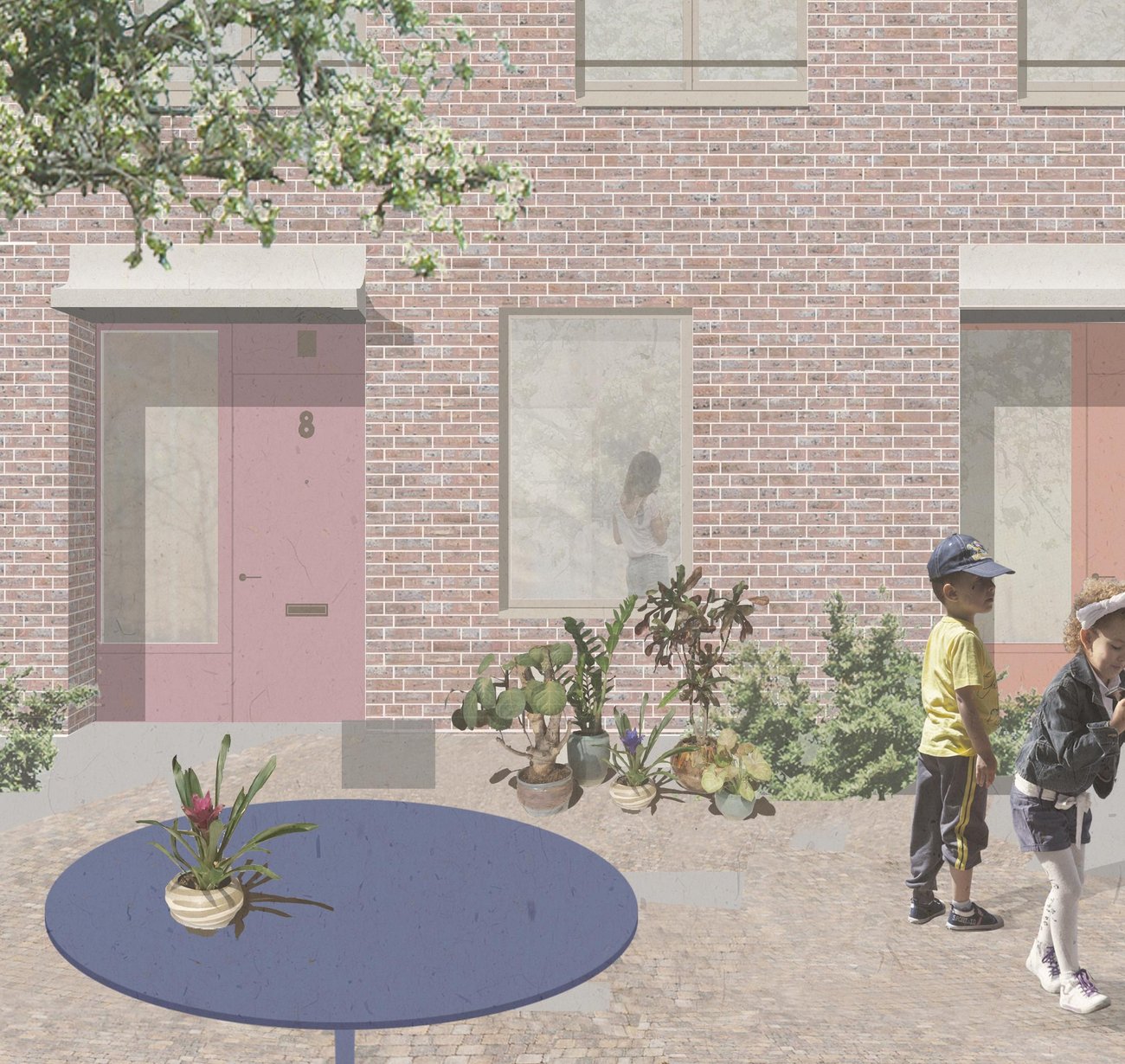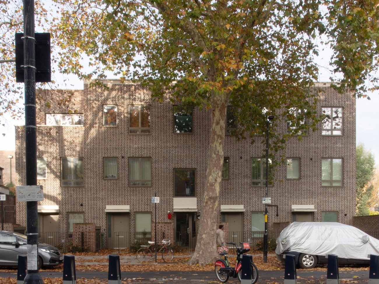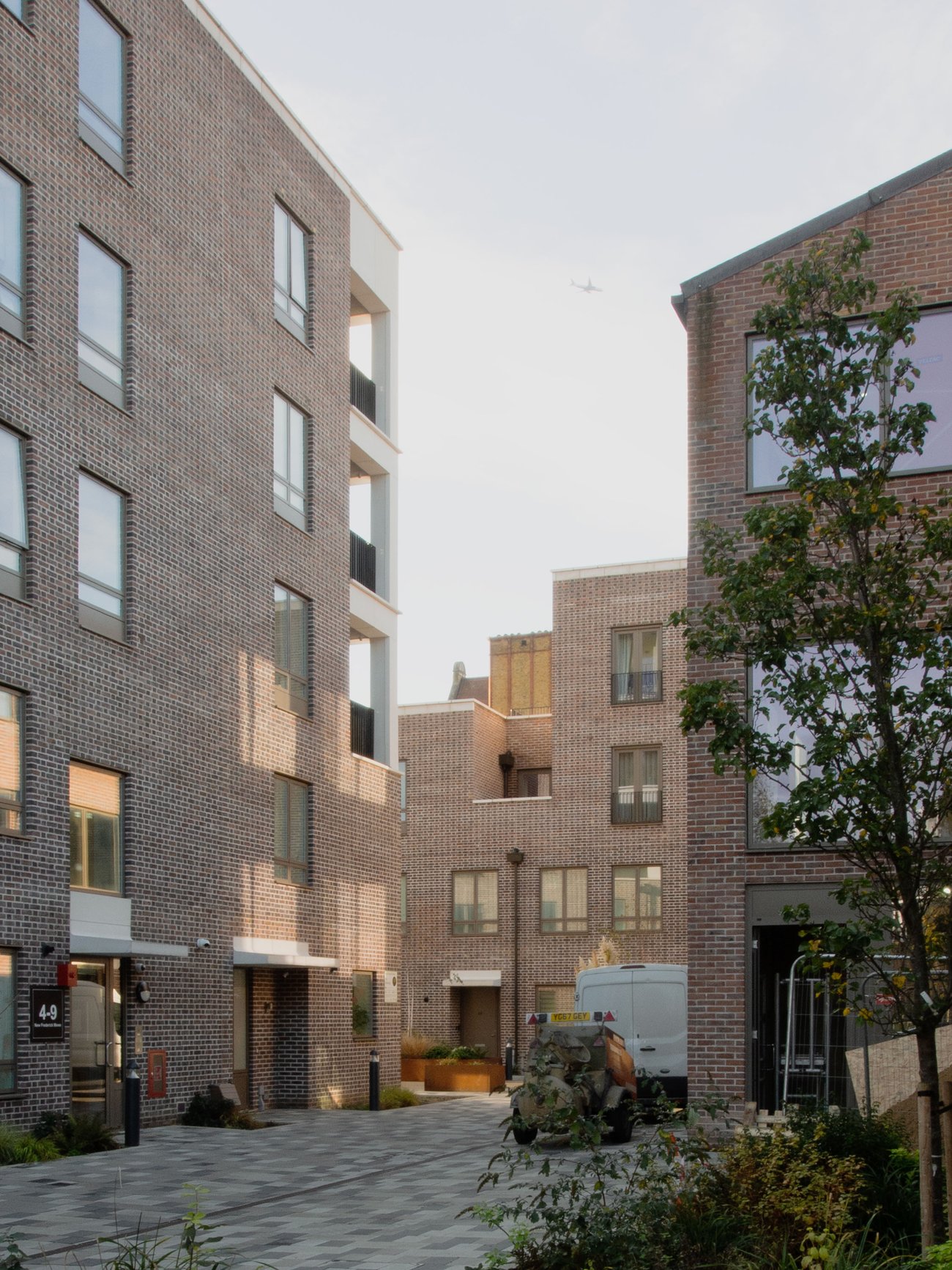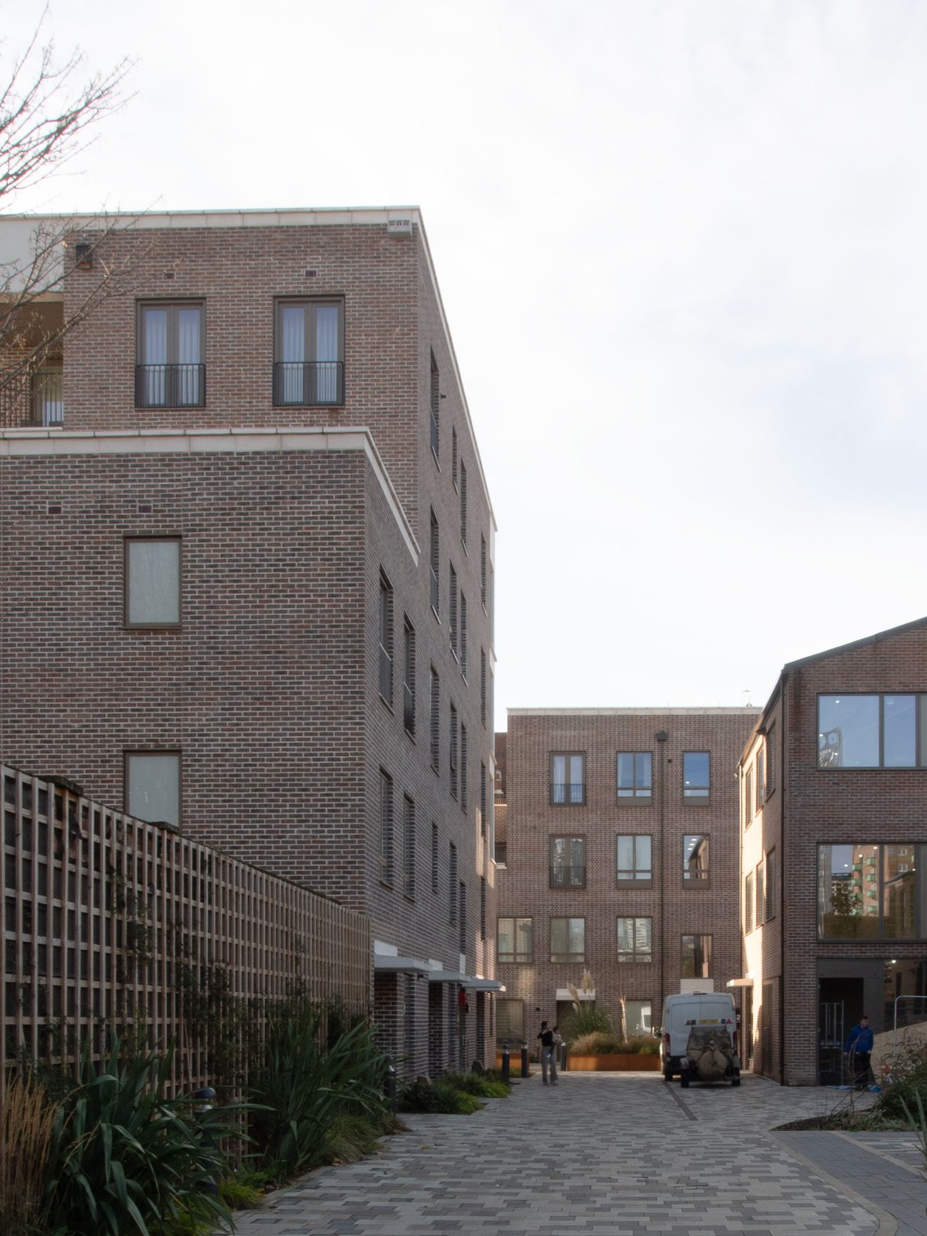 The brick and precast elements refer to the adjacent houses and school while the robust block massing refers to the industrial past of the site. A new workspace building frames the pedestrian mews and the ground floor flats and maisonettes are accessed directly from outside, bringing footfall to support and protect communal play for new residents, neighbours and children on their way to school.