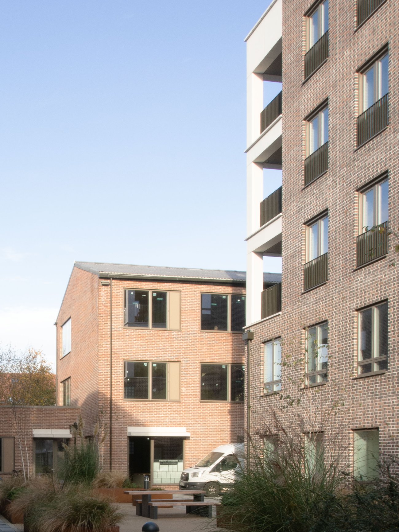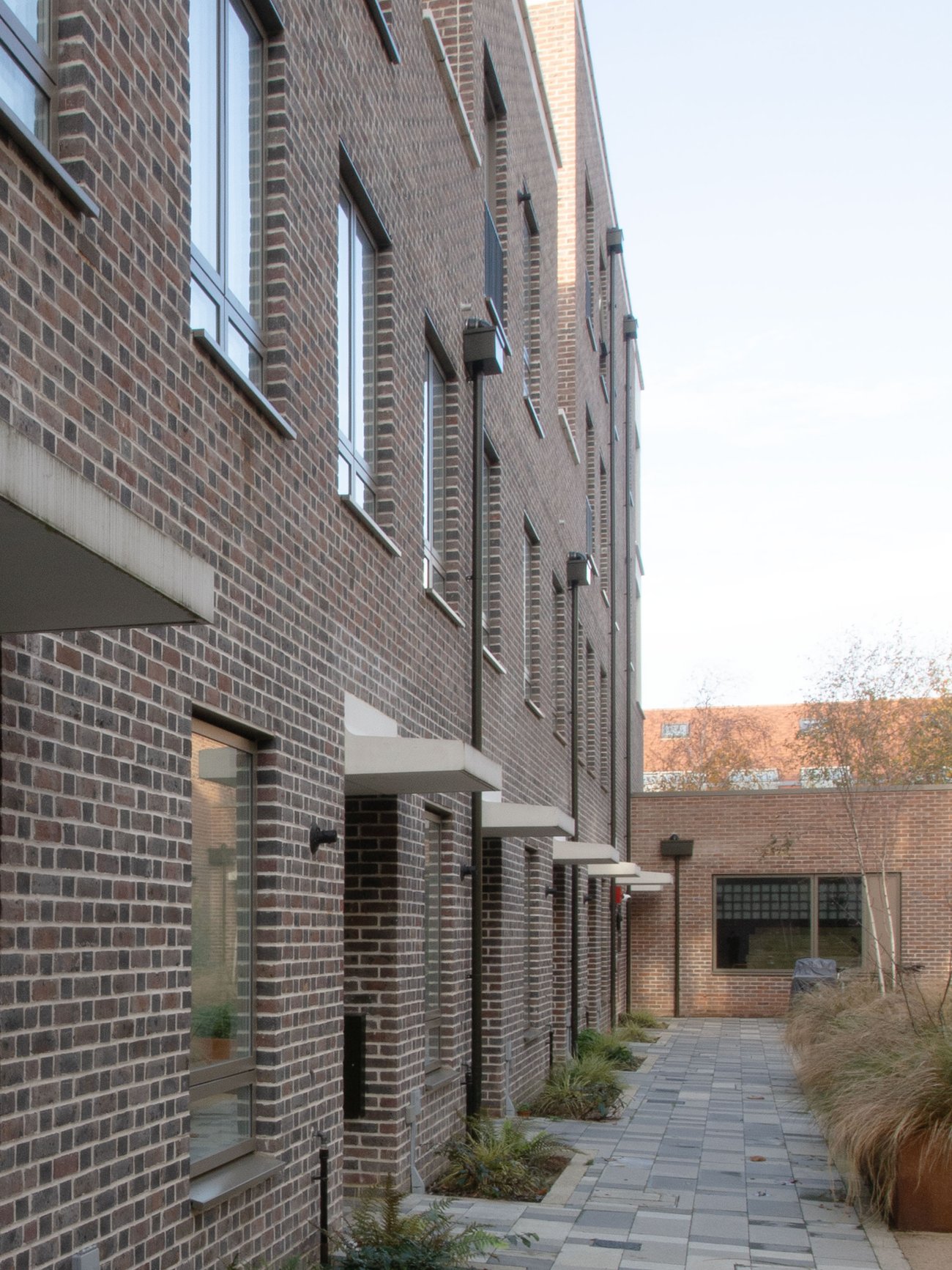The project is a small collection of apartments, mews houses and workspace buildings, tucked in a backstreet next to Kennington underground station. The site is bound by Braganza Street, a residential road of low rise post war housing, and some fragments and facsimiles of Georgian terraces, and Keyworth School to the south, a large Victorian board school, with a network of more recent extensions.