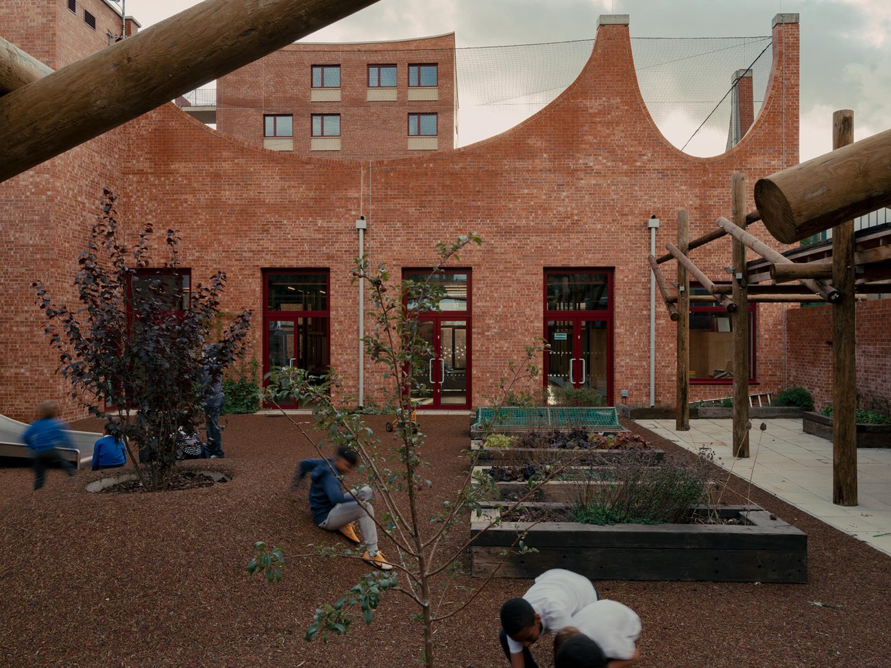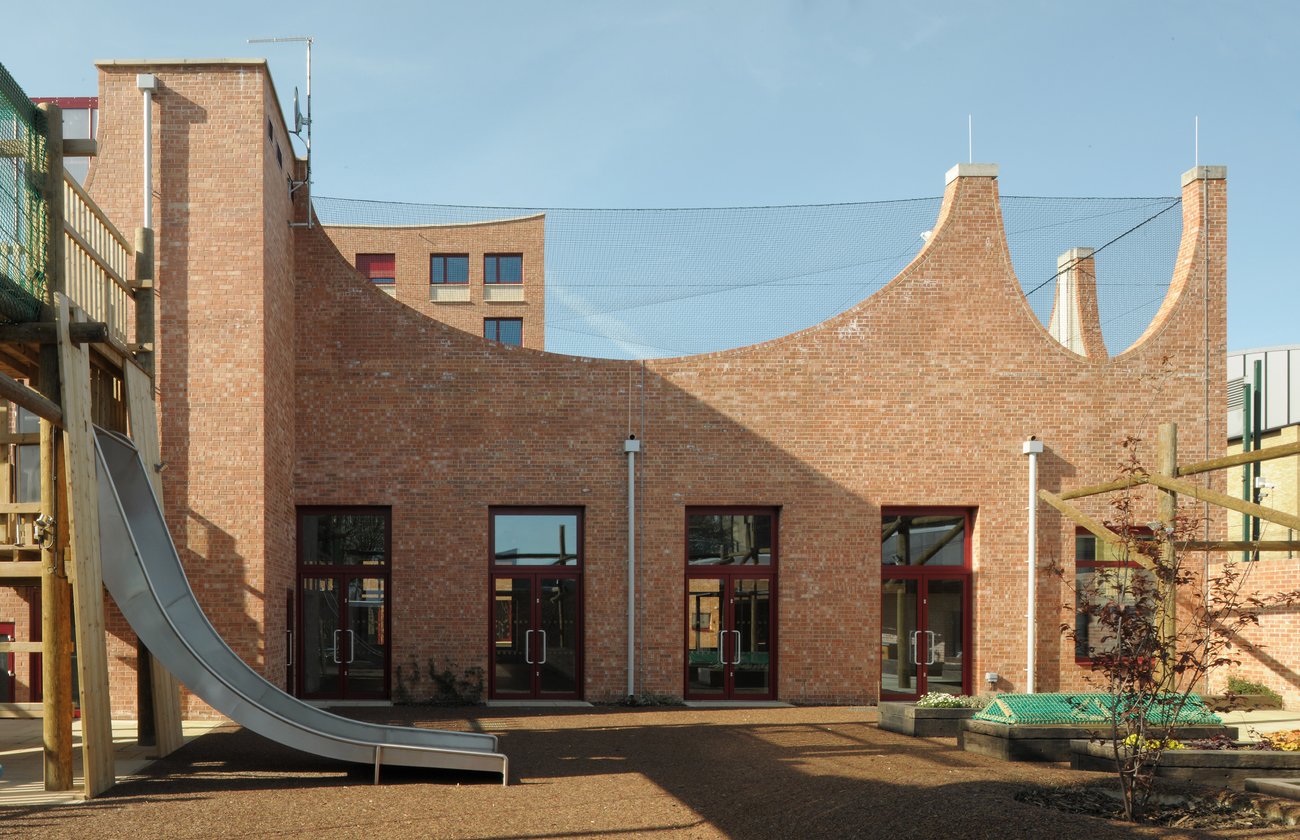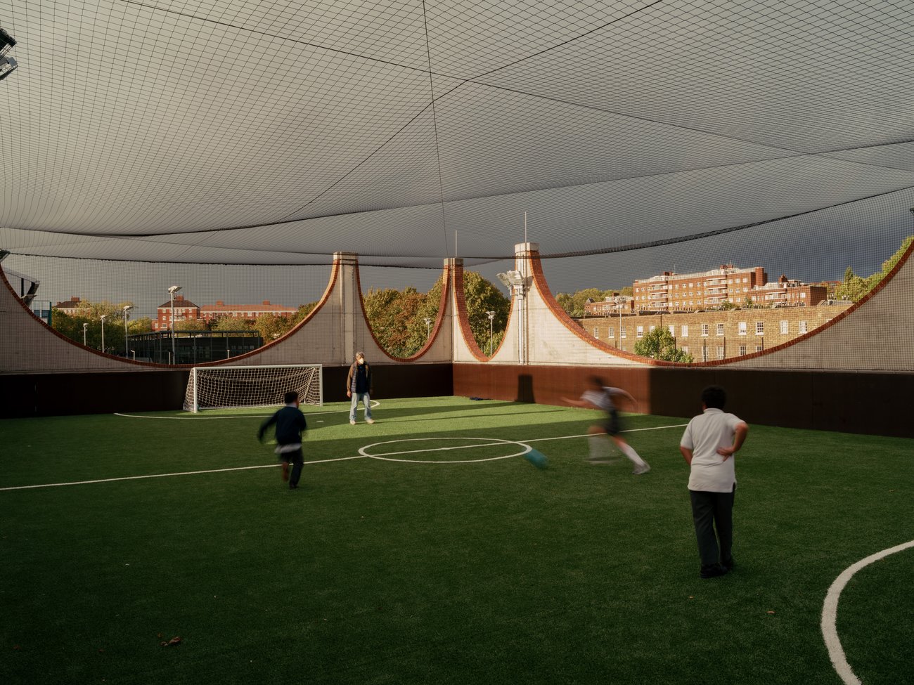 Inside, tall rooms provide imagination for the children and are topped with a roof level, lift-accessible football pitch, enclosed in swooping inverted arches, like child’s model of a palace.