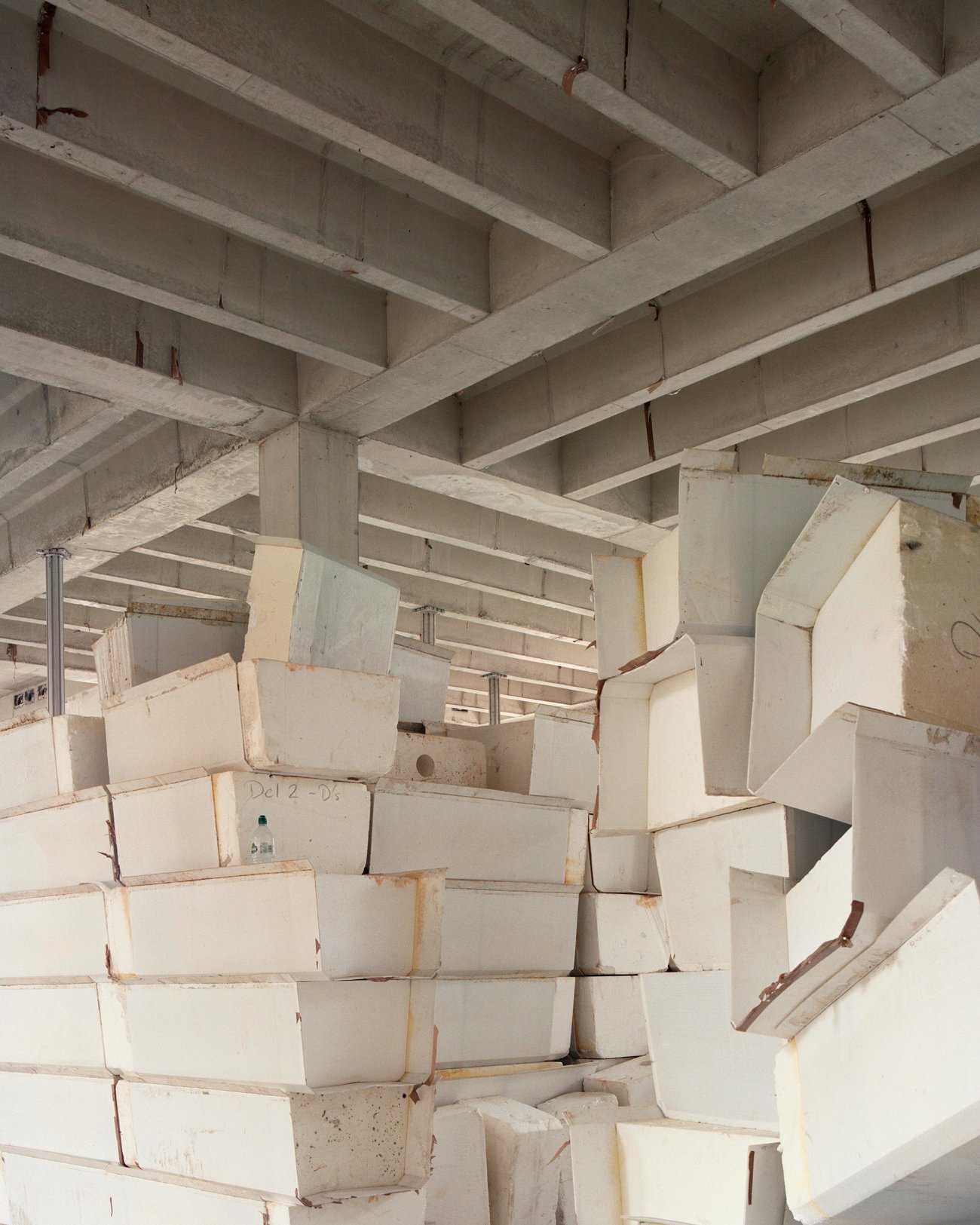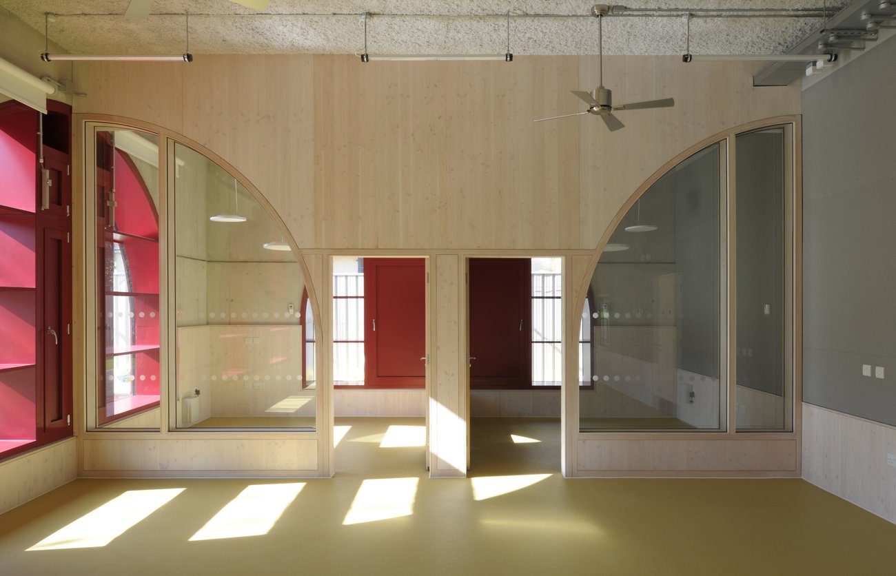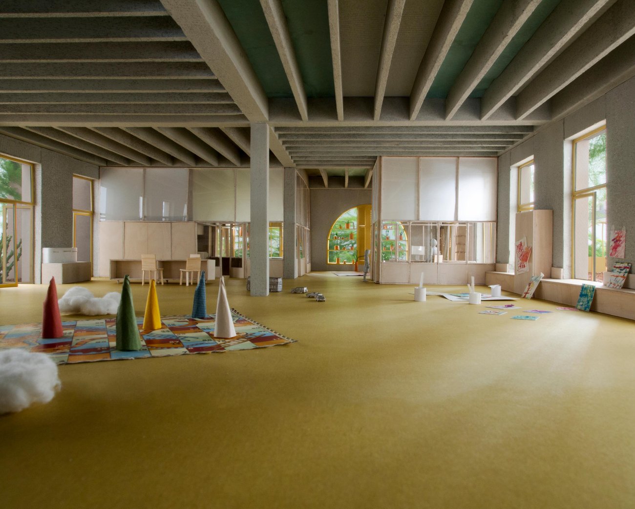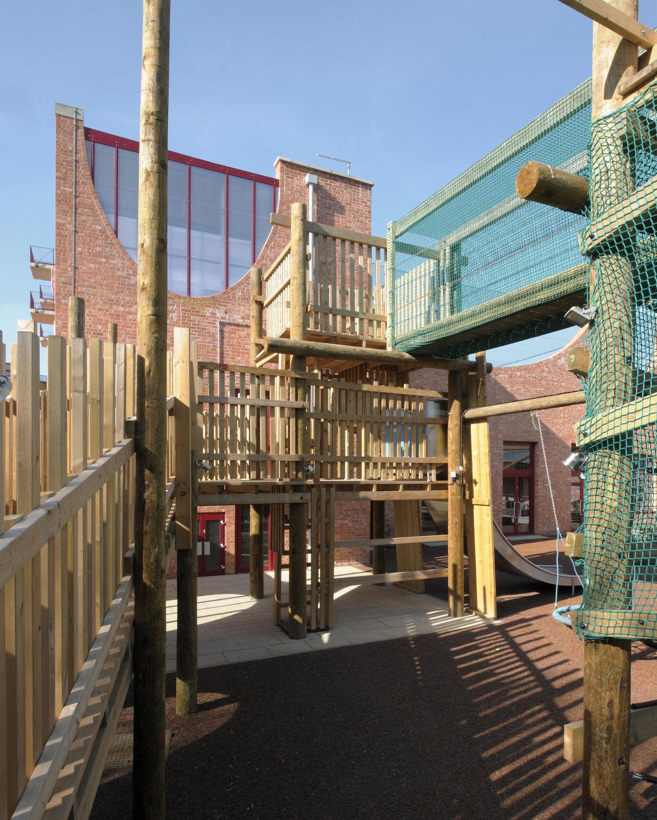 Inside, tall rooms provide imagination for the children and are topped with a roof level, lift-accessible football pitch, enclosed in swooping inverted arches, like child’s model of a palace.