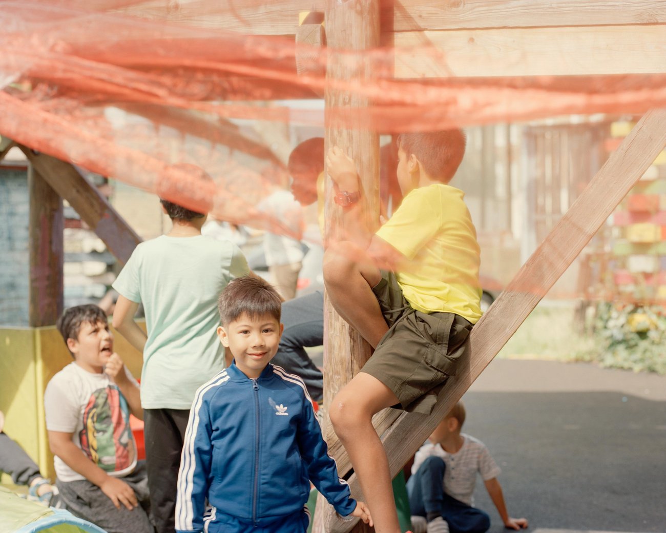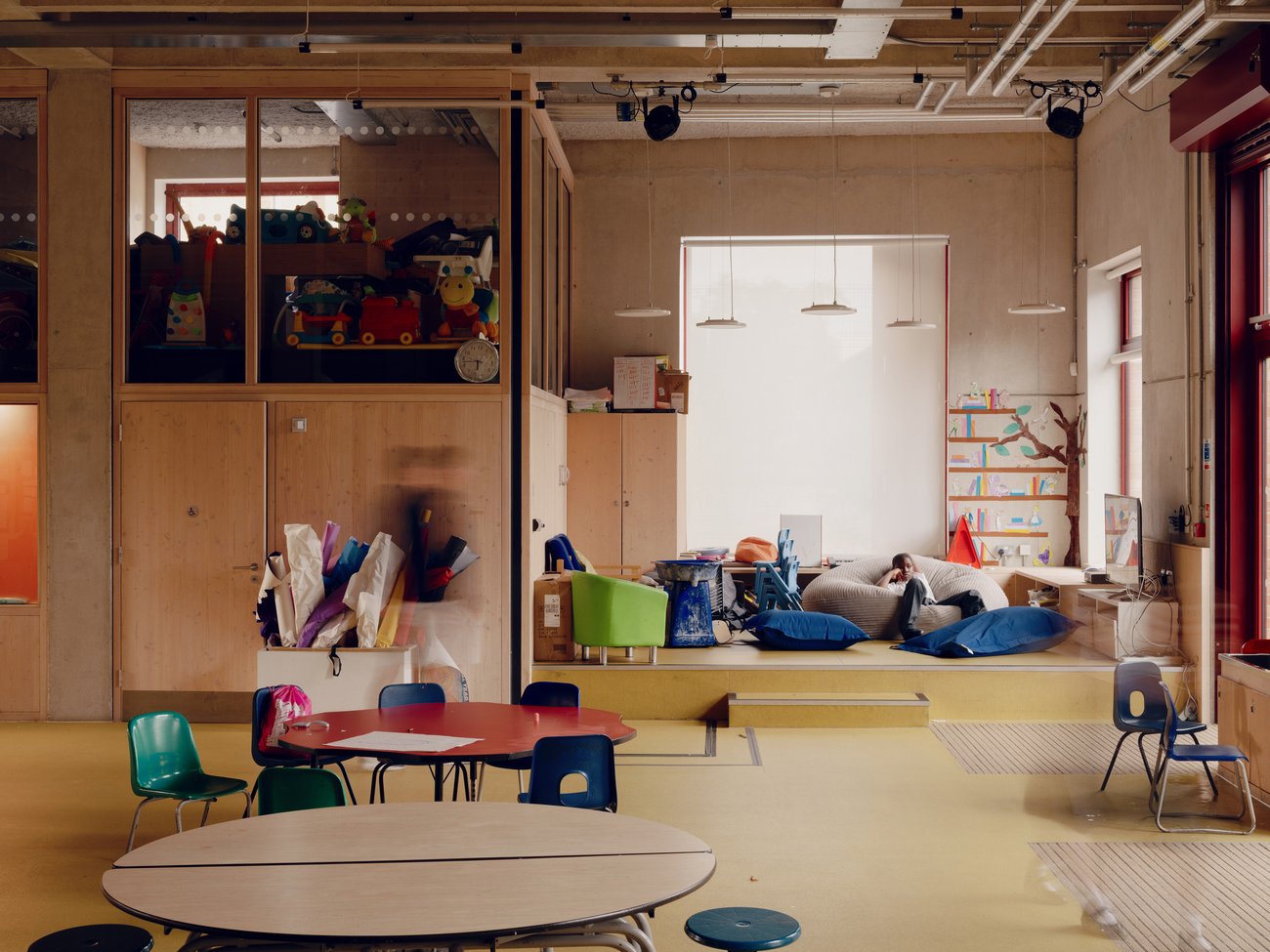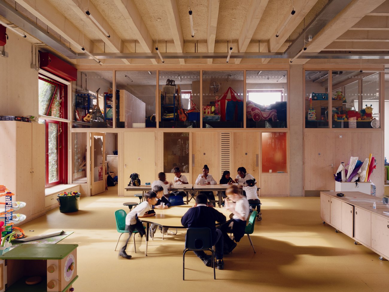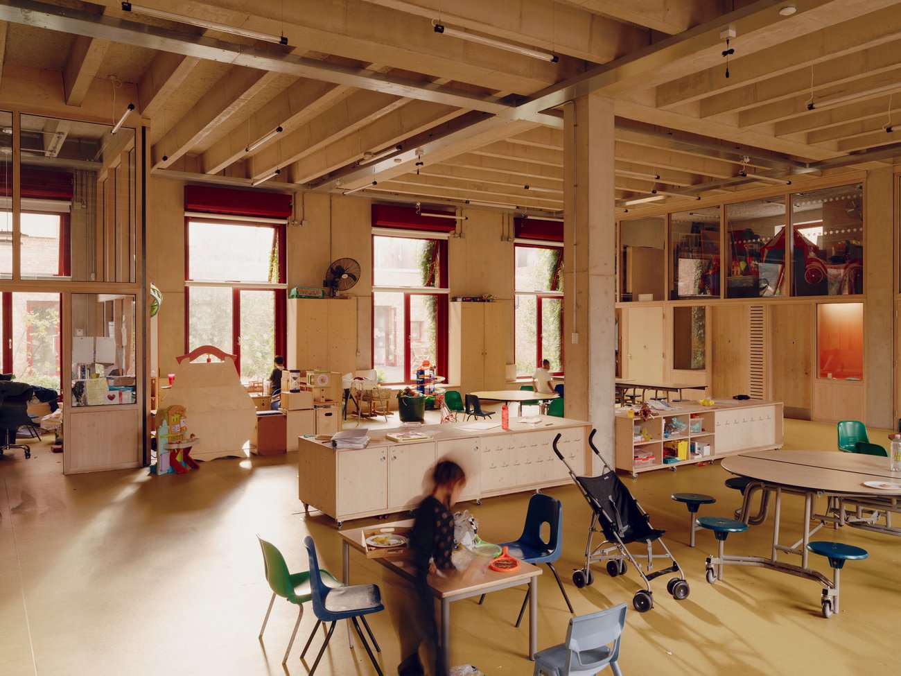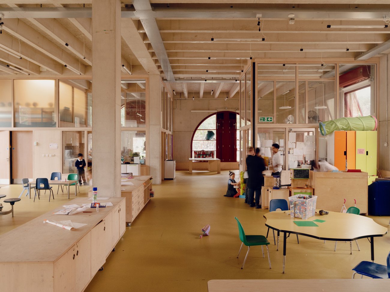 Offering childcare and providing a critical lifeline to working parents since the 1970s we worked with Plot 10, and a local nursery school, from the outset to design the community facilities for them. This spirit of deep engagement continued through the project with exploratory workshops, ethnography and film, to observe the ways children used the existing spaces and structures, prompt design approaches and direct expressions, with neon signage and logos translated by Axel Feldmann.