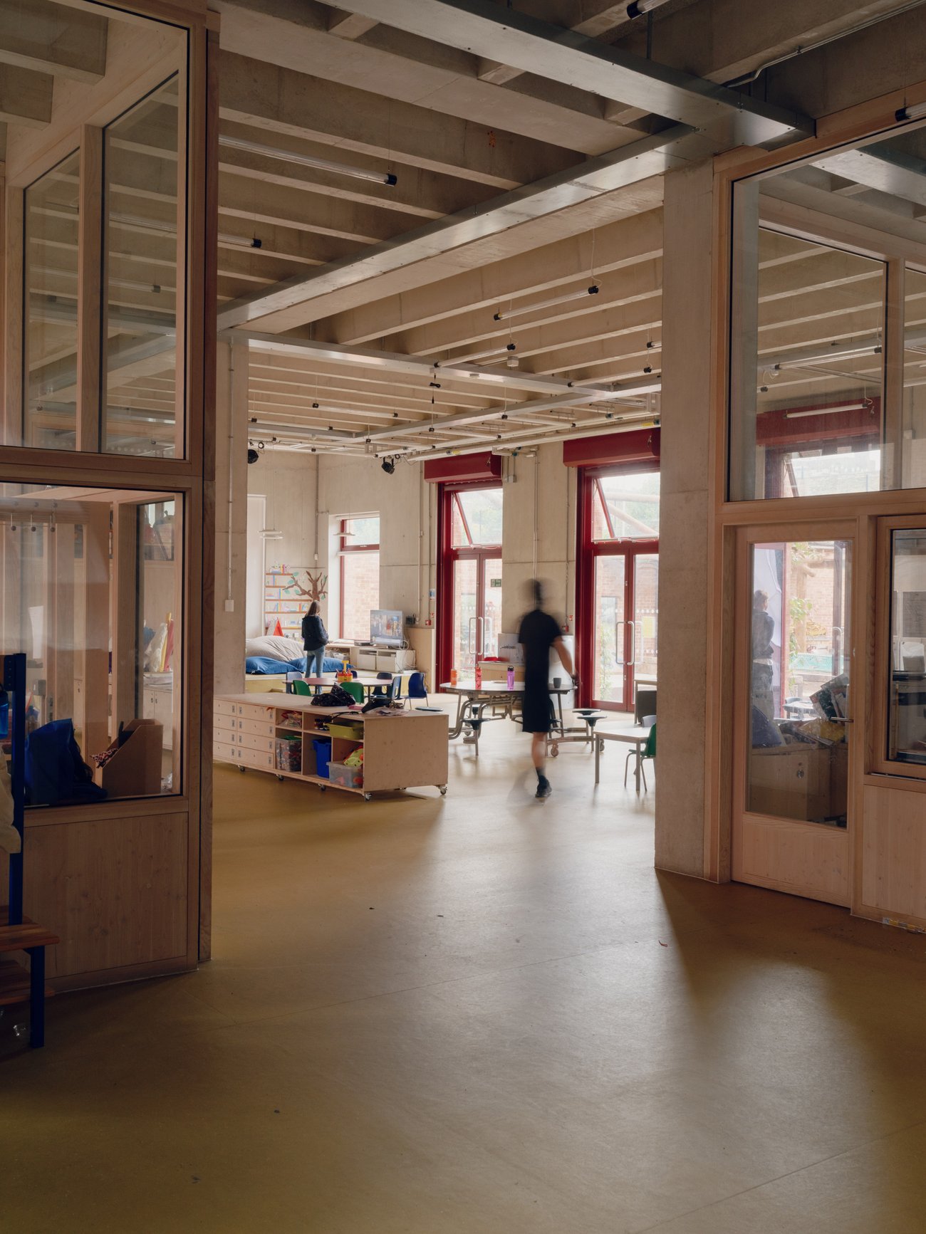 The community play facilities and youth club are arranged as an enfilade of courtyards and rooms, behind a unifying celebratory façade that sits directly on the public realm. Controlled glimpses into courtyards and deep window reveals quietly satisfy the stringent safeguarding and privacy demands, whilst projecting a welcome vitality. The shopfront windows display children’s work to the neighbourhood, whilst screening the classrooms behind, and the drama club entrance hall is a kitchen to encourage parents to come in for a cup of tea.
