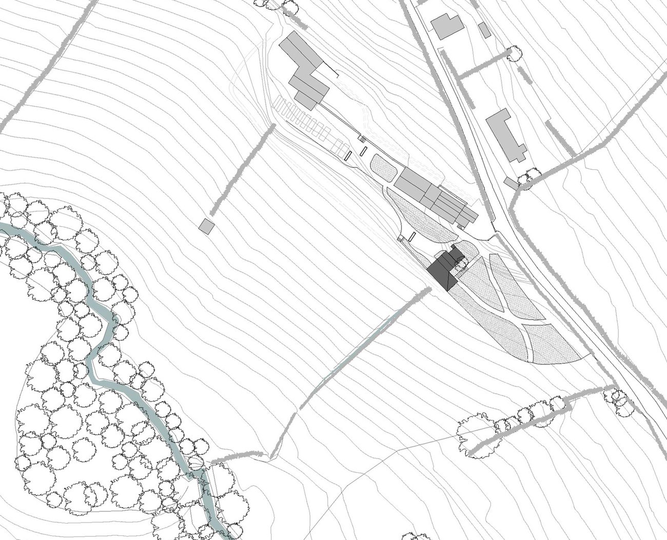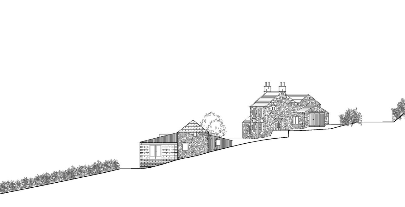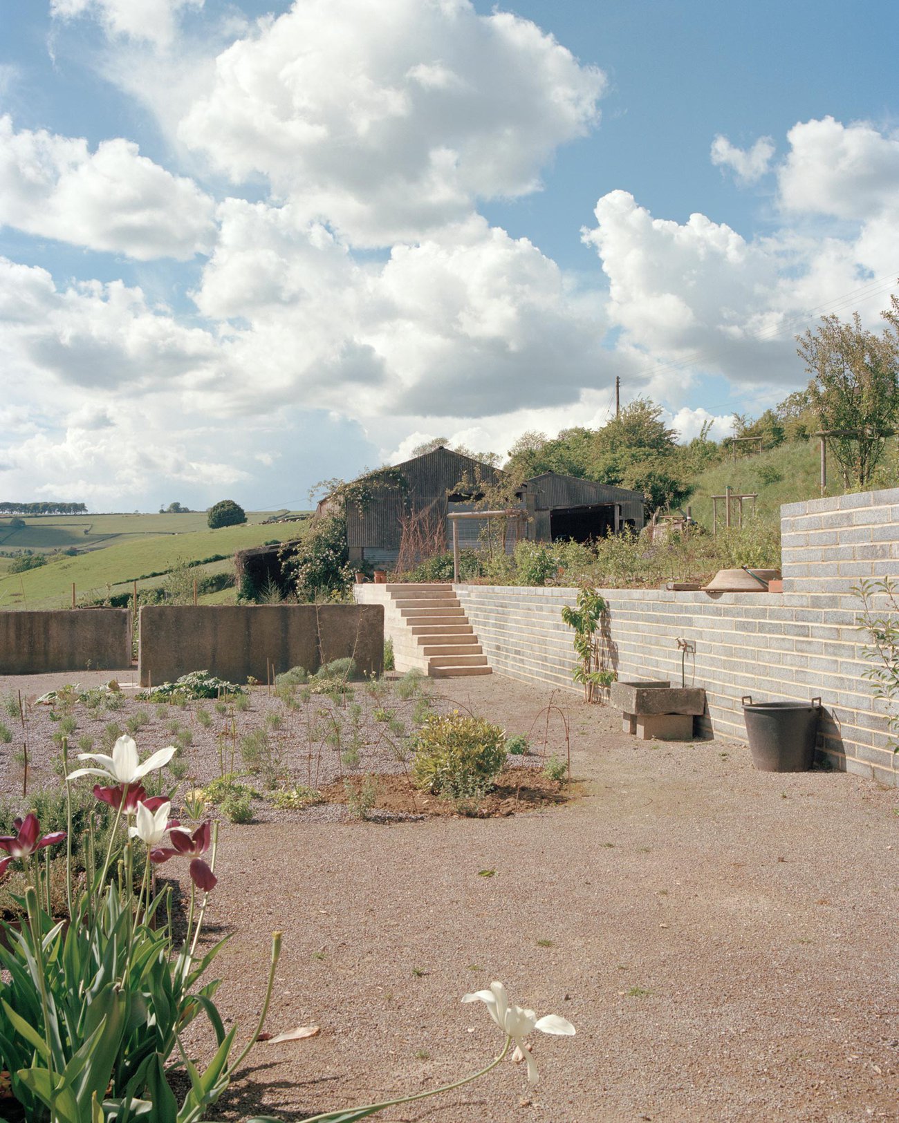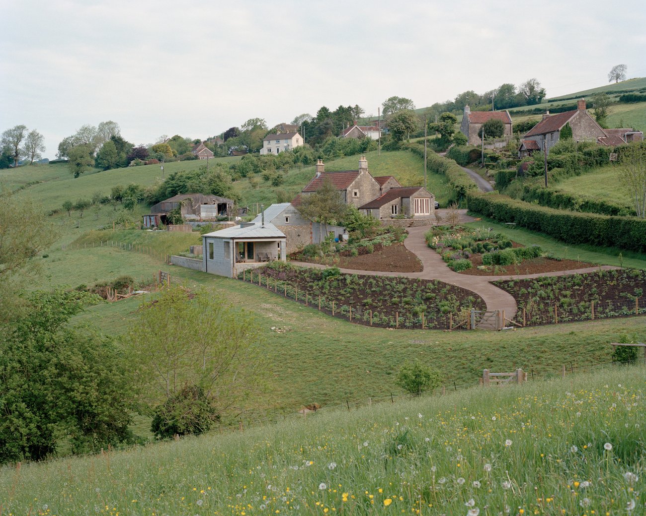 In a close collaboration with Dan Pearson, the existing steep topography was sculpted to give habitable platforms and cascading gardens and to allow this collection of small buildings to both nestle into and spring from the hillside. The Milking Barn strongly marks the edge of the habitable territory of house and gardens.