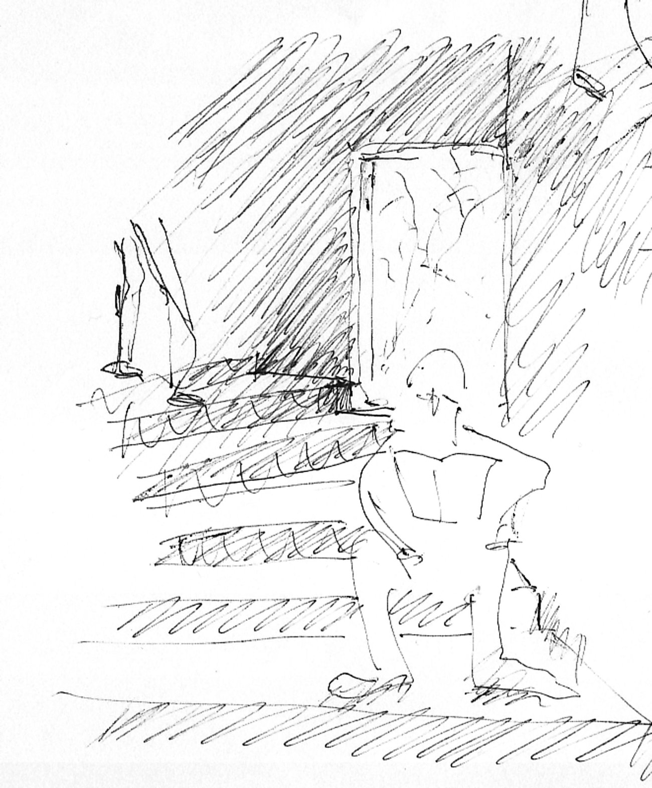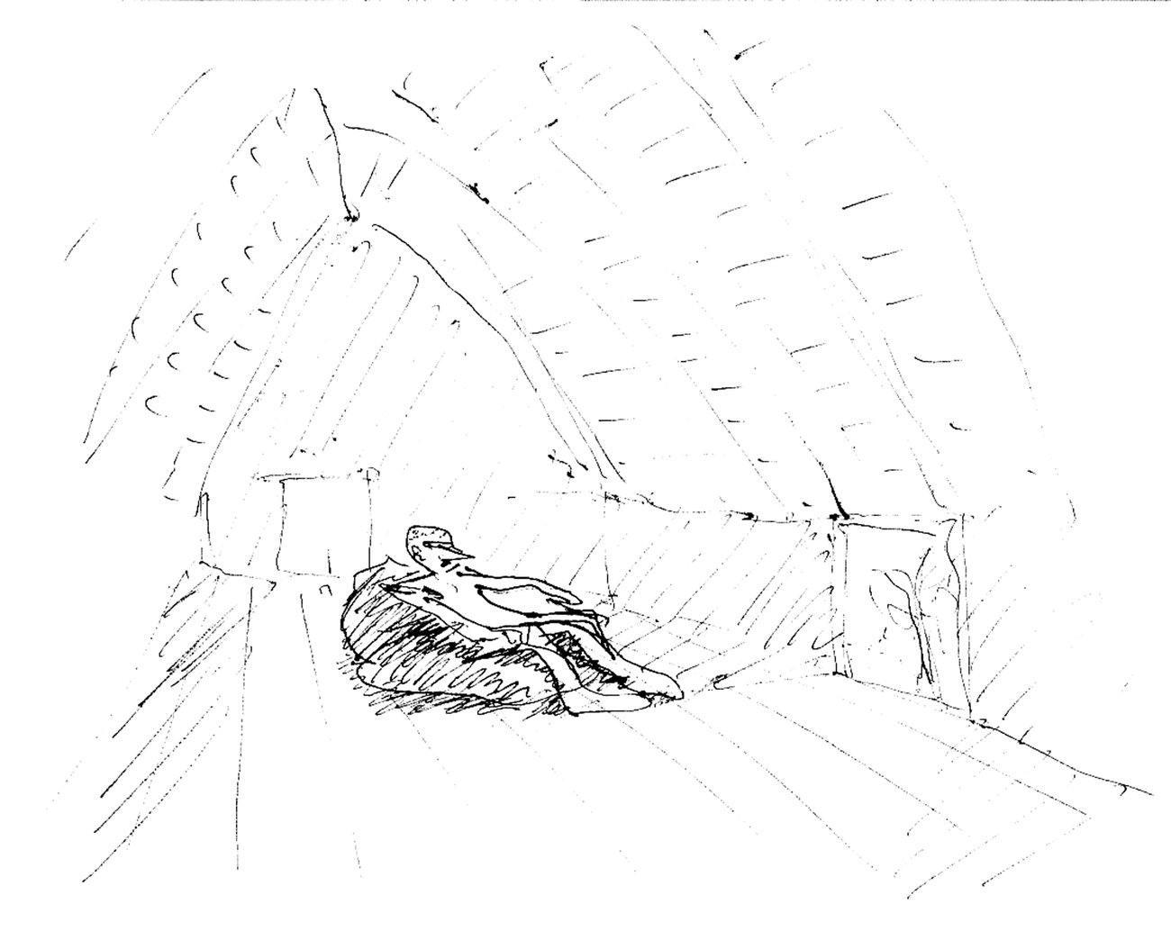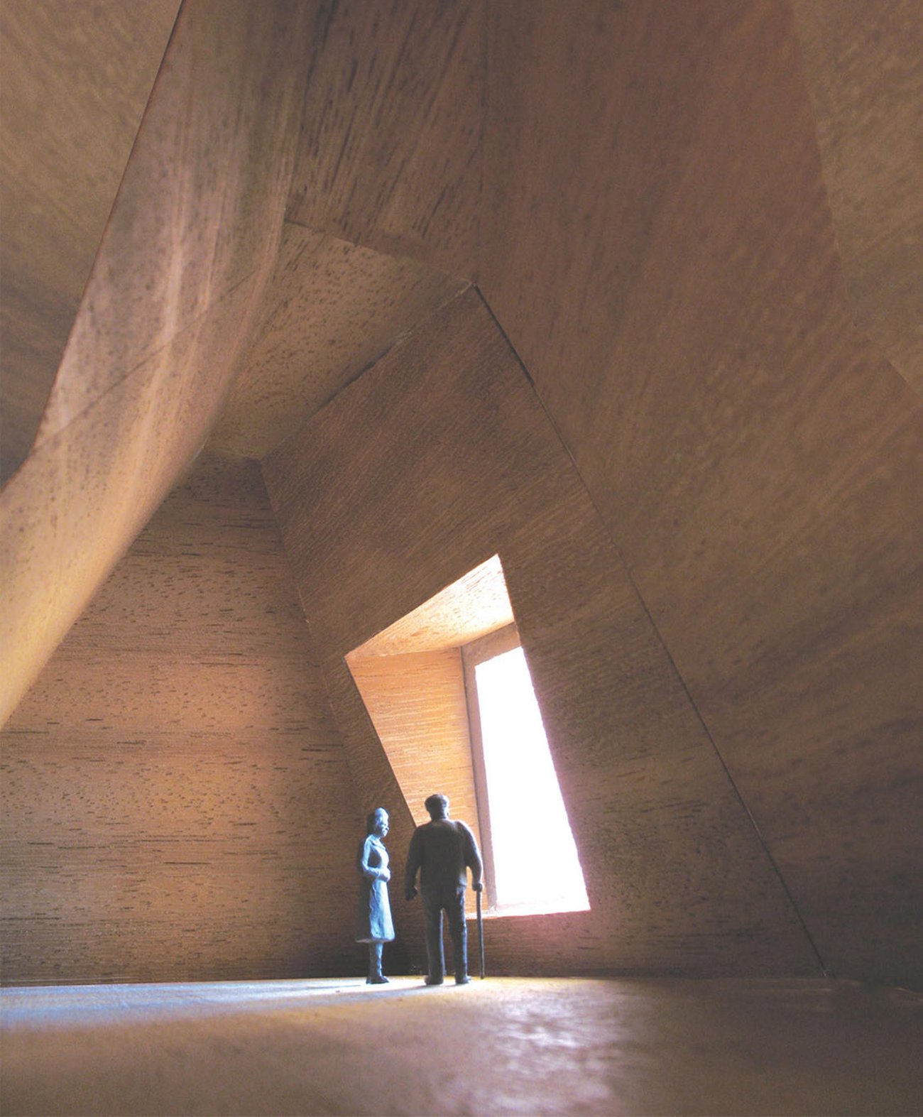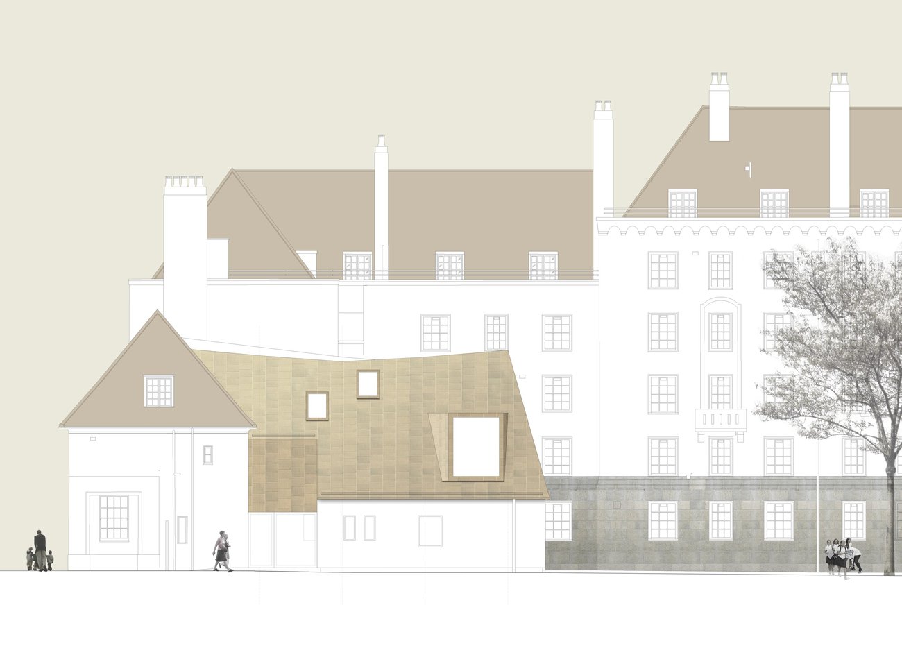 From outside the extension picks up the surrounding Arts and Crafts language of steeply pitched roofs and homely stability, but twists it to something fresh and surprising. Inside a lofty wooden room of softly folded roof planes; an exuberant home for the imagination and play. A big window, with a window seat and cushions, looks out to the sky and the trees in the court, and so the room is as much for individual day-dreaming or an intimate chat.
