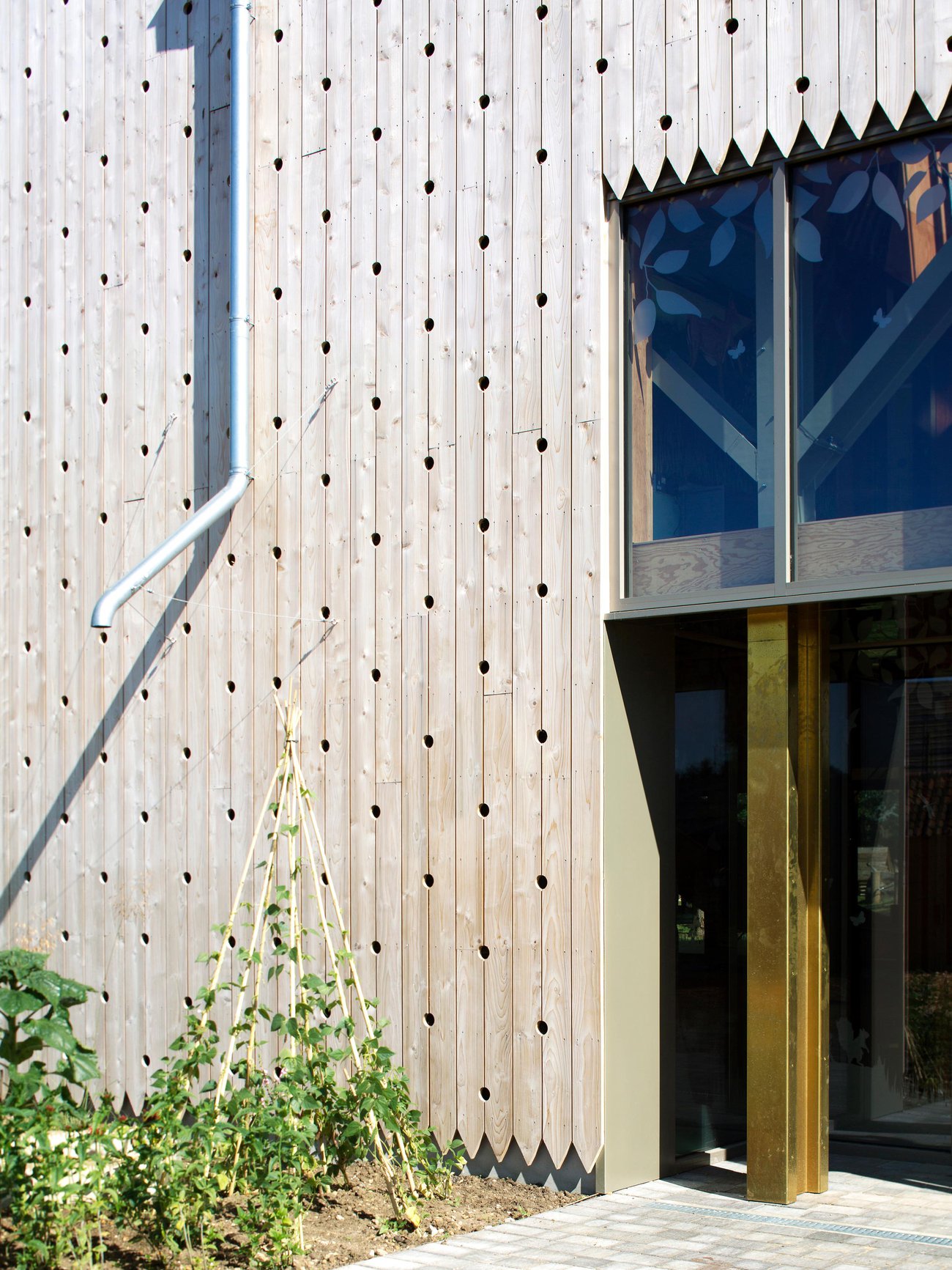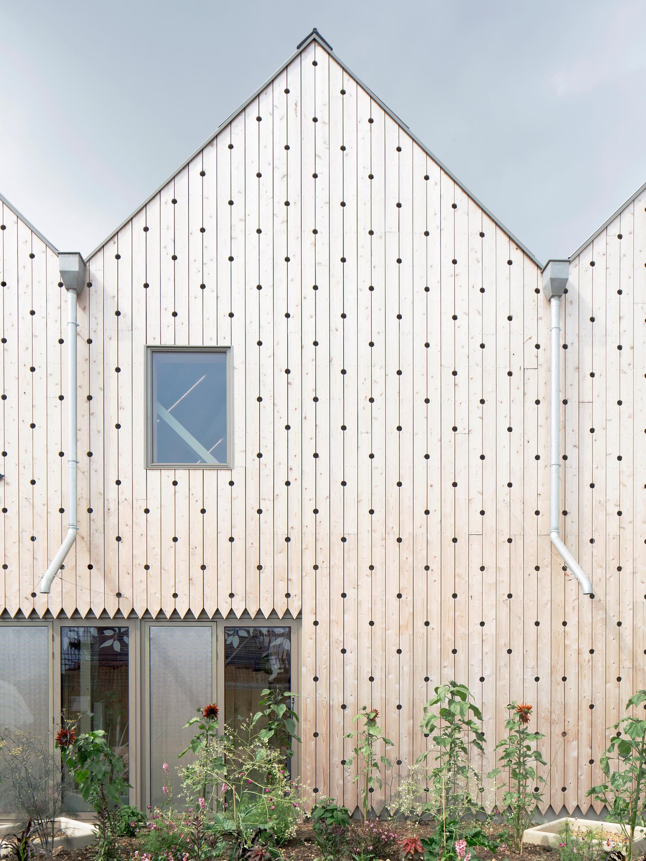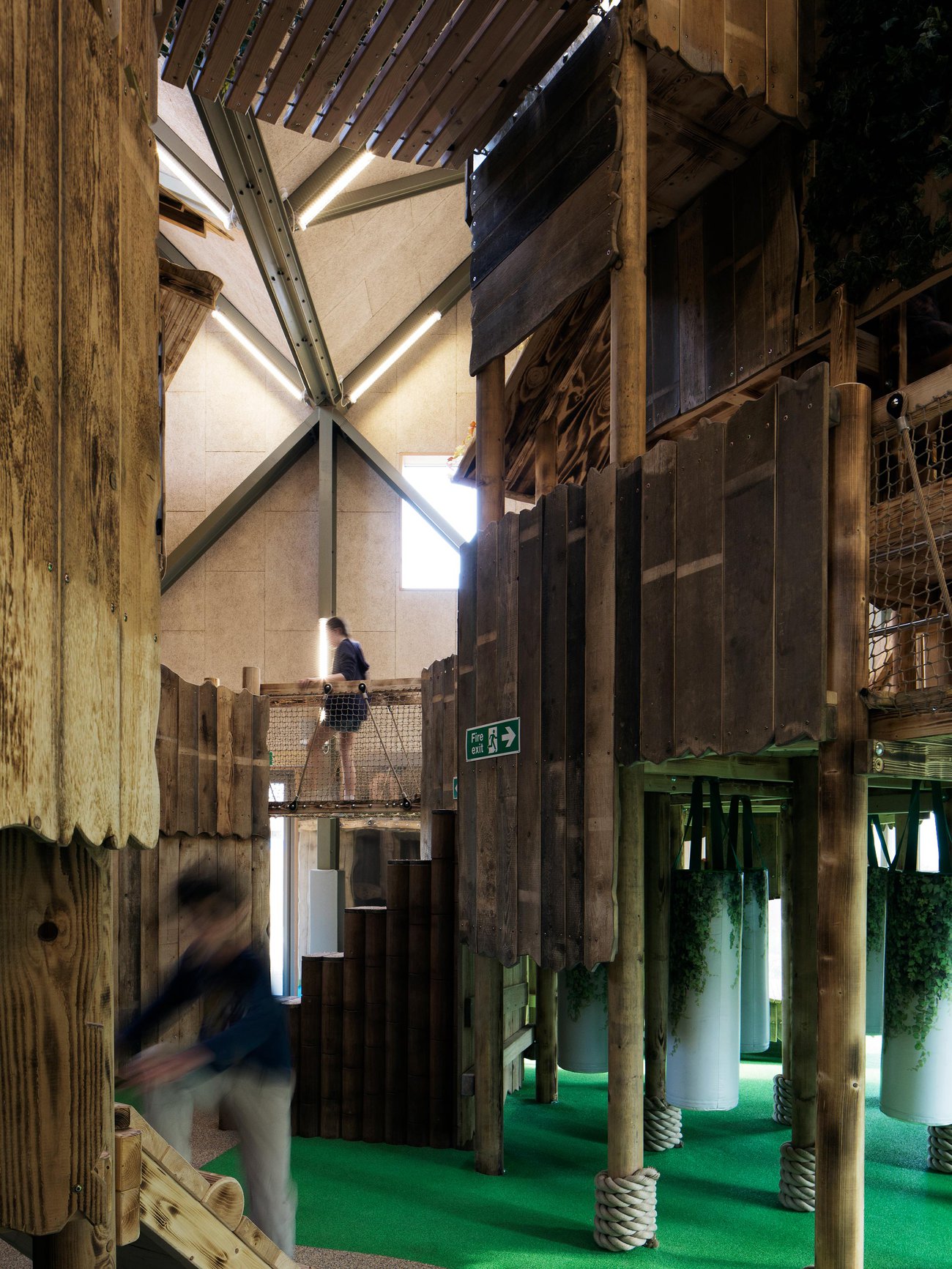 Meanwhile the Play Barn reinvents a much-maligned type: the indoor play centre. Traditionally dark, noisy, plastic-filled and airless, these spaces are often tolerated rather than enjoyed. The Play Barn transforms that experience, creating an environment that connects children and families to nature while offering the excitement and practicality of indoor play. Continuing the theme of natural play established in the adjacent outdoor landscape, the design encourages risk, adventure, and sensory engagement with the natural world. The building is filled with daylight, controlled sunlight, and natural ventilation, with constant visual and tactile connections to trees, sky, and weather. Deep window seats, rainwater spouts, and natural materials reinforce the sensory and seasonal richness of the place, supported by mirrored surfaces and acoustic absorption for a calm, immersive atmosphere.
