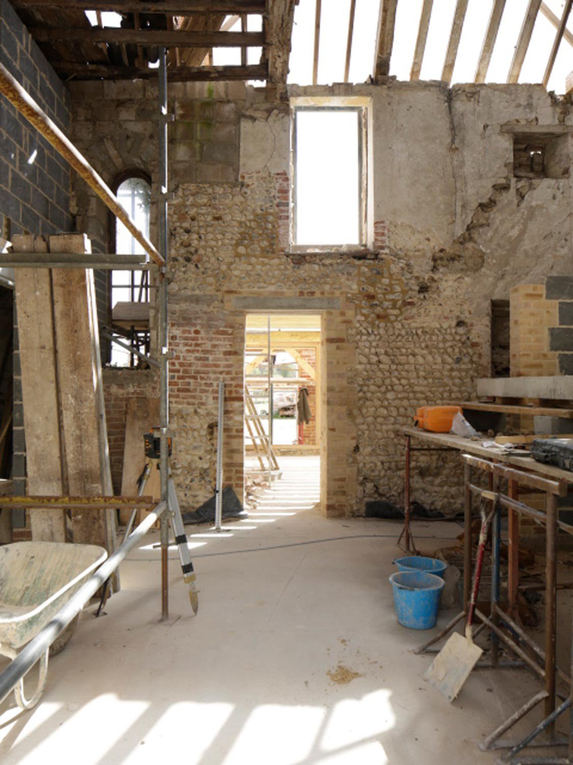 The cottages were radically transformed to host new facilities including a gallery, reception, offices, event facilities and wellbeing centre, with unsympathetic interventions and structurally defective elements carefully stripped out. New circulation reinvents the former massive chimney and gentle repairs exposed the original flint walls.