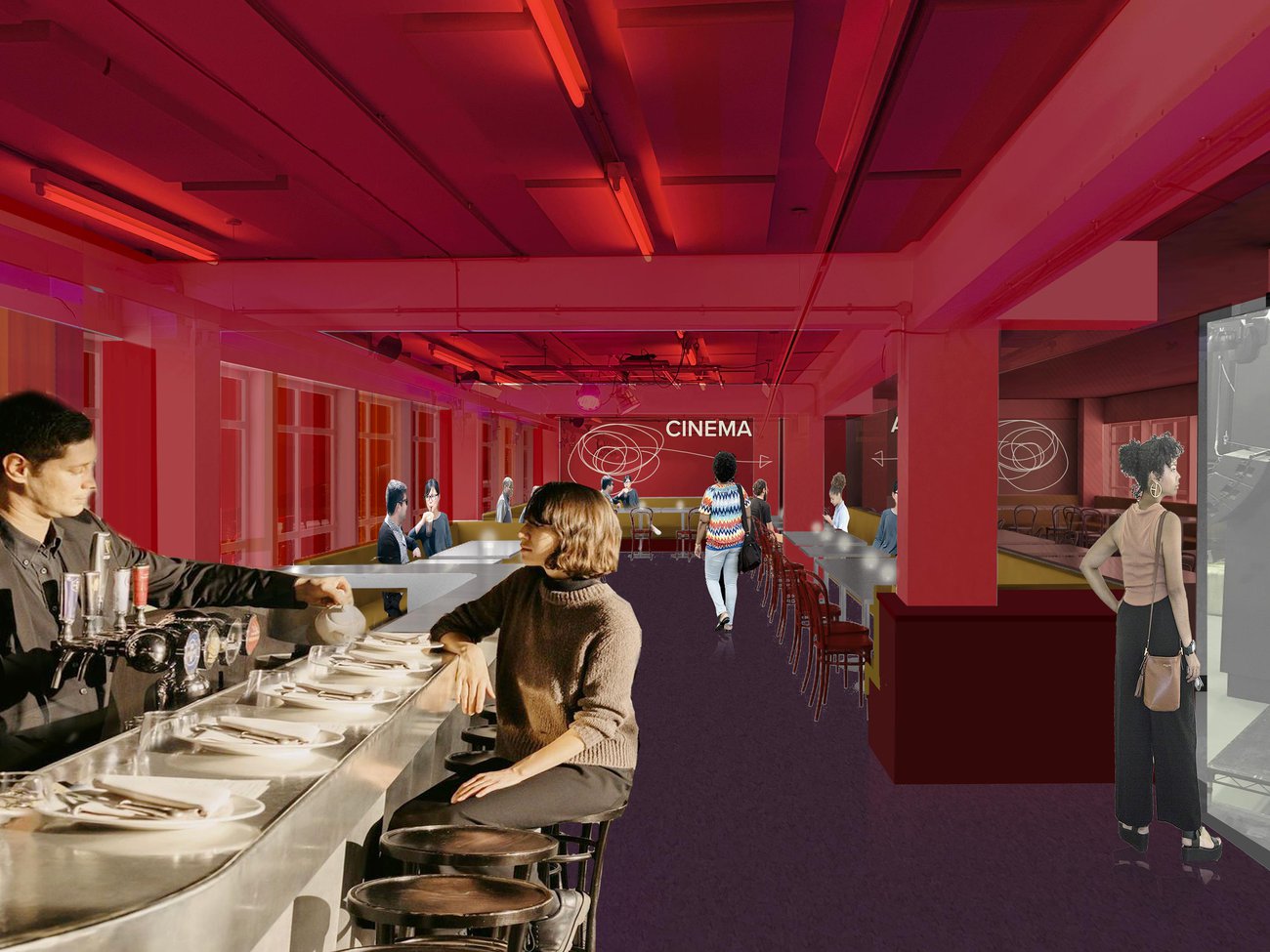 The first phase - a new Cinebar - delivers a clear entry and welcome to the cinemas and a social destination for the whole building, to connect its many diverse users. Rich Mix has an enviable audience and tenant diversity but lacked the spaces that promote encounter and sociability. We were interested in how a bar could be inviting and aspirational without excluding and gentrifying, how it could work both by day and night, and have a strong character whilst establishing a clear Rich Mix identity. The next phase will be the opening up and expansion of the ground floor.