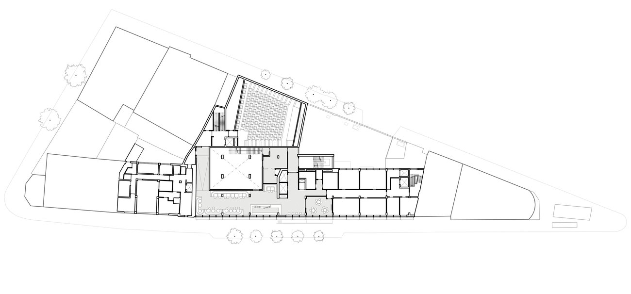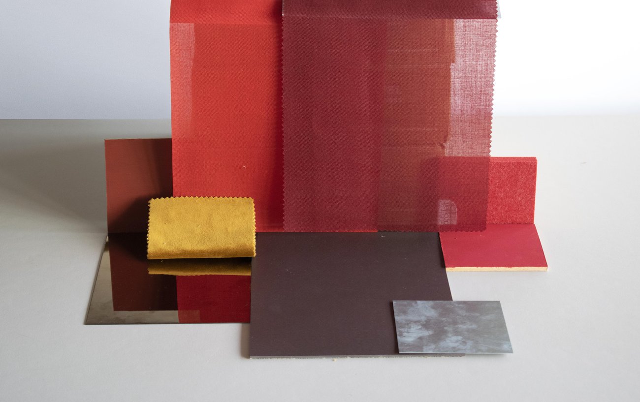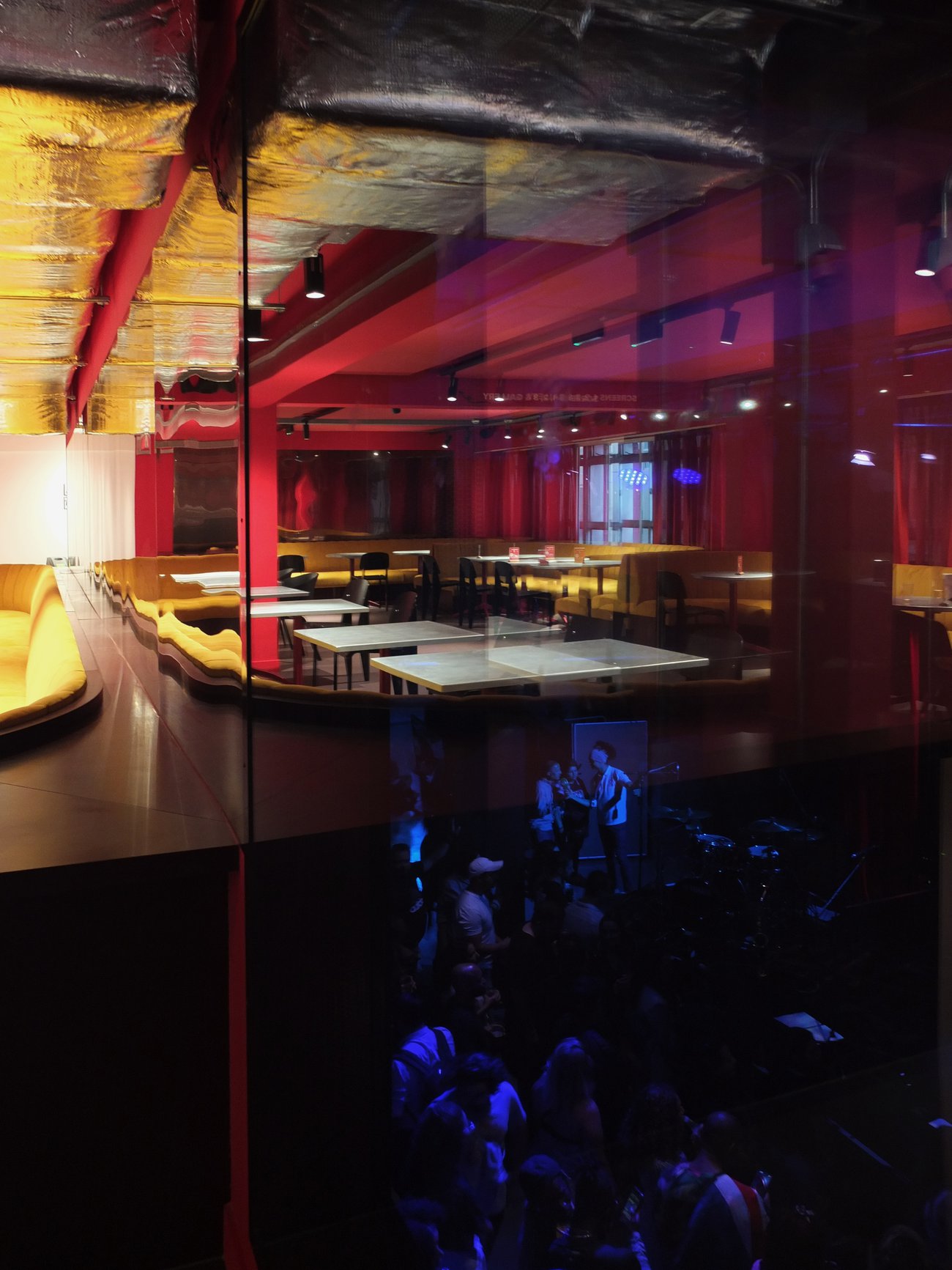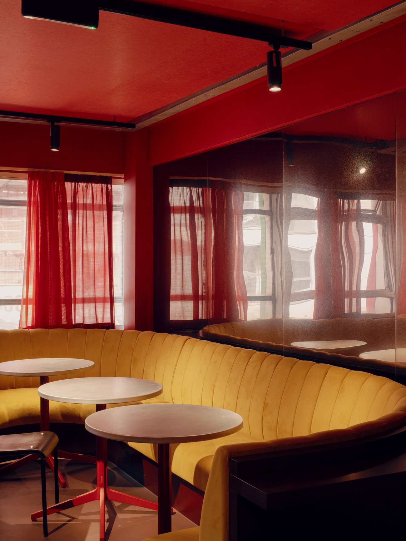 Drawing on Matisse’s red paintings and Hermann Czech cafes, a bold red and warm palette encompasses red felt acoustic absorption and two shades of overlapping curtain to allow for a change in atmosphere from day to night. Rimex steel wall panels balance the room and give soft distorted reflections of the light, the colours and the bar users. An acoustic window to the stage gives sight of live events without the sound and, set flush to the wall panels produces an ambiguous layering of reflection and shadow, invoking a liminal condition between screen and reality.