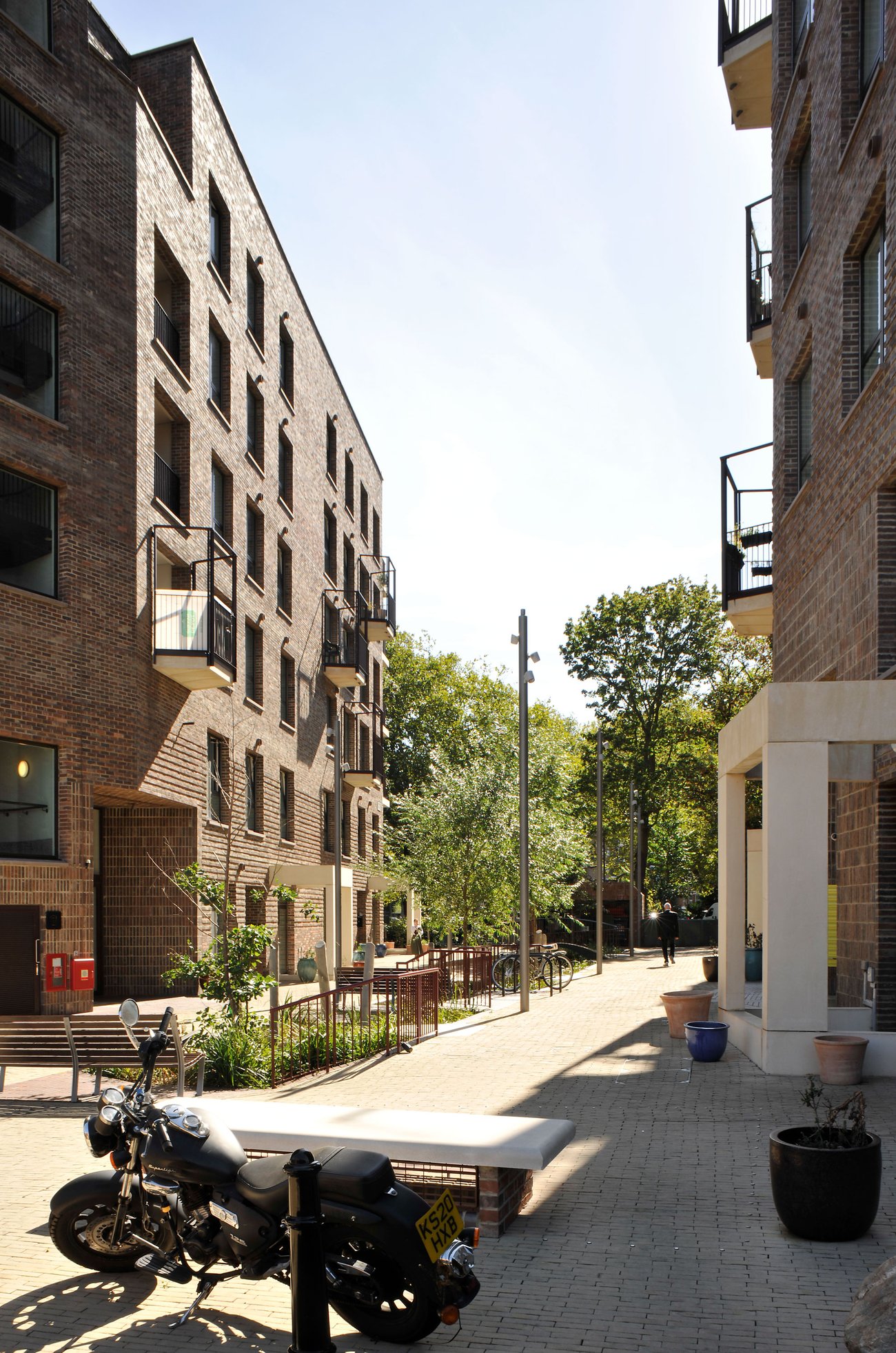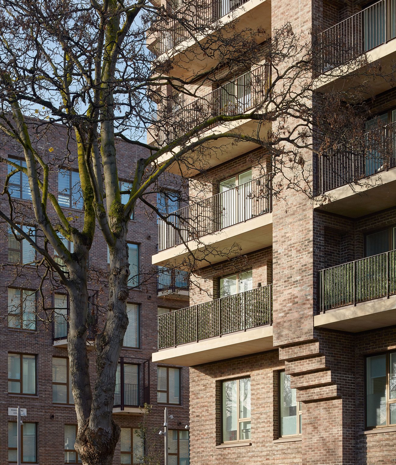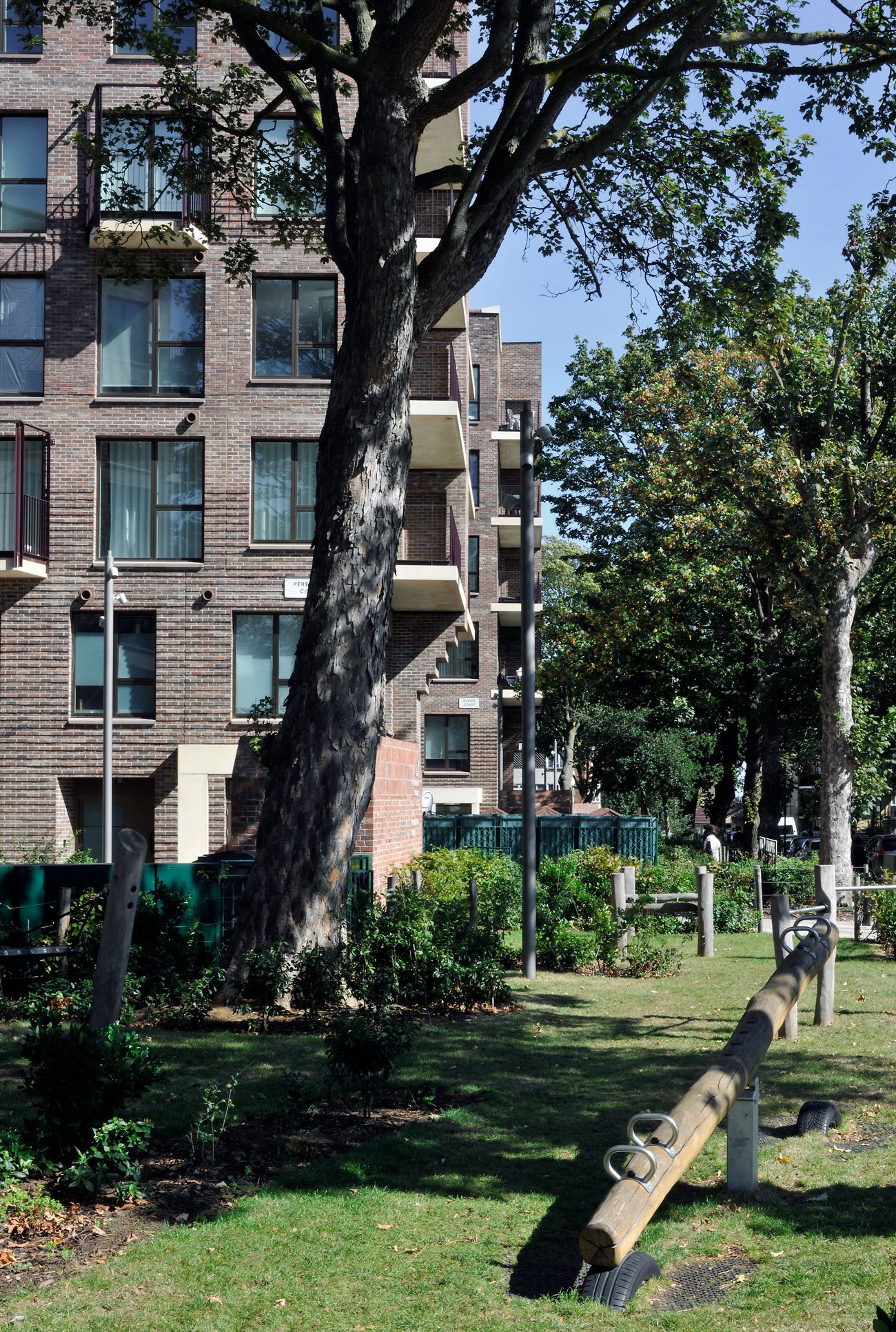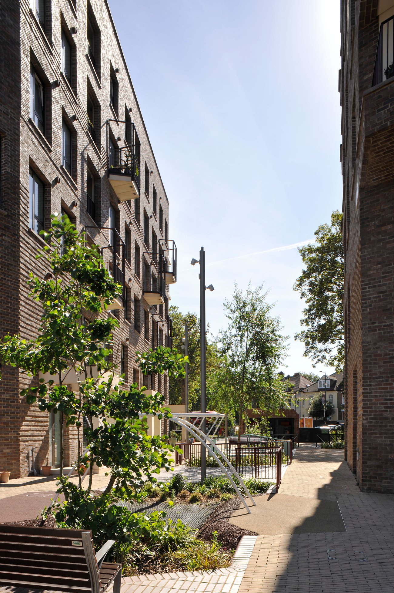 In a synthesis of architecture and landscape, buildings flex around retained mature trees and open out onto Clapton Common. The inflected geometry of the buildings improves internal qualities of daylight, views and aspect but also shapes the courtyards as comfortable, spatially interesting, outdoor rooms. The public realm, intensively shaped as a place of play and social encounter, extends into the entrance lobbies, and sets the foundations for an integrated community. It is a model for high-density family living, suitable for the changing, diverse needs of contemporary London.