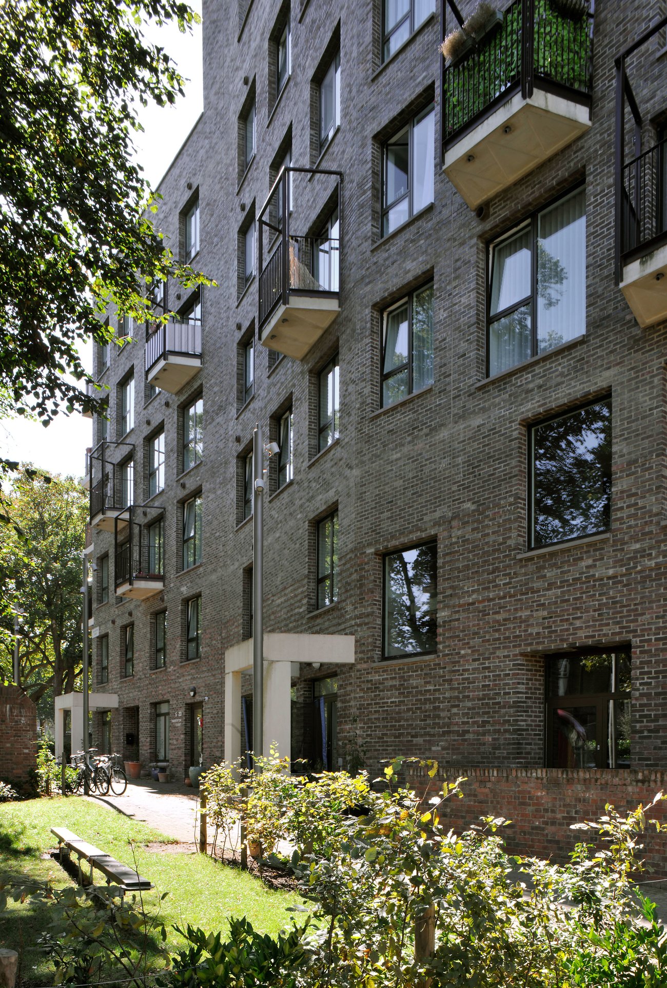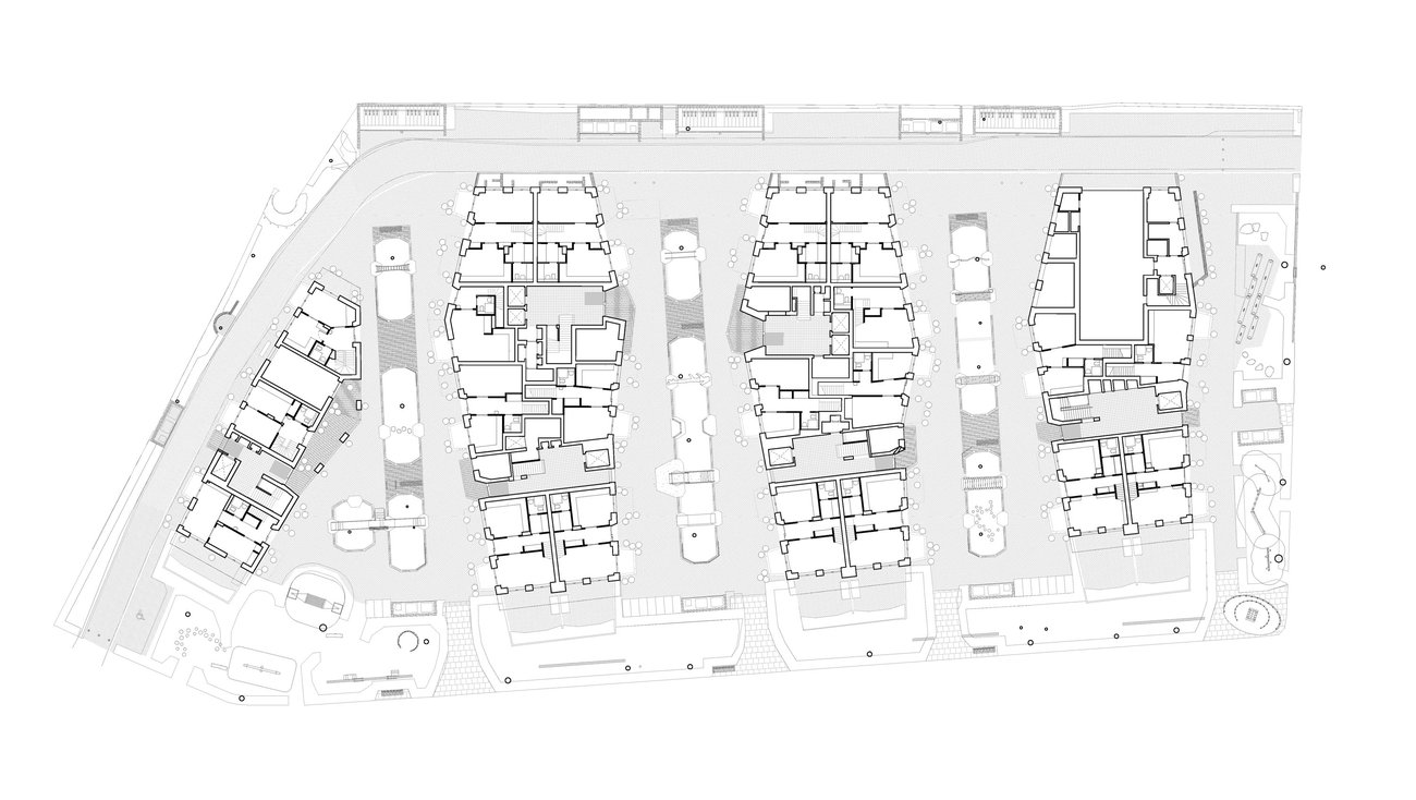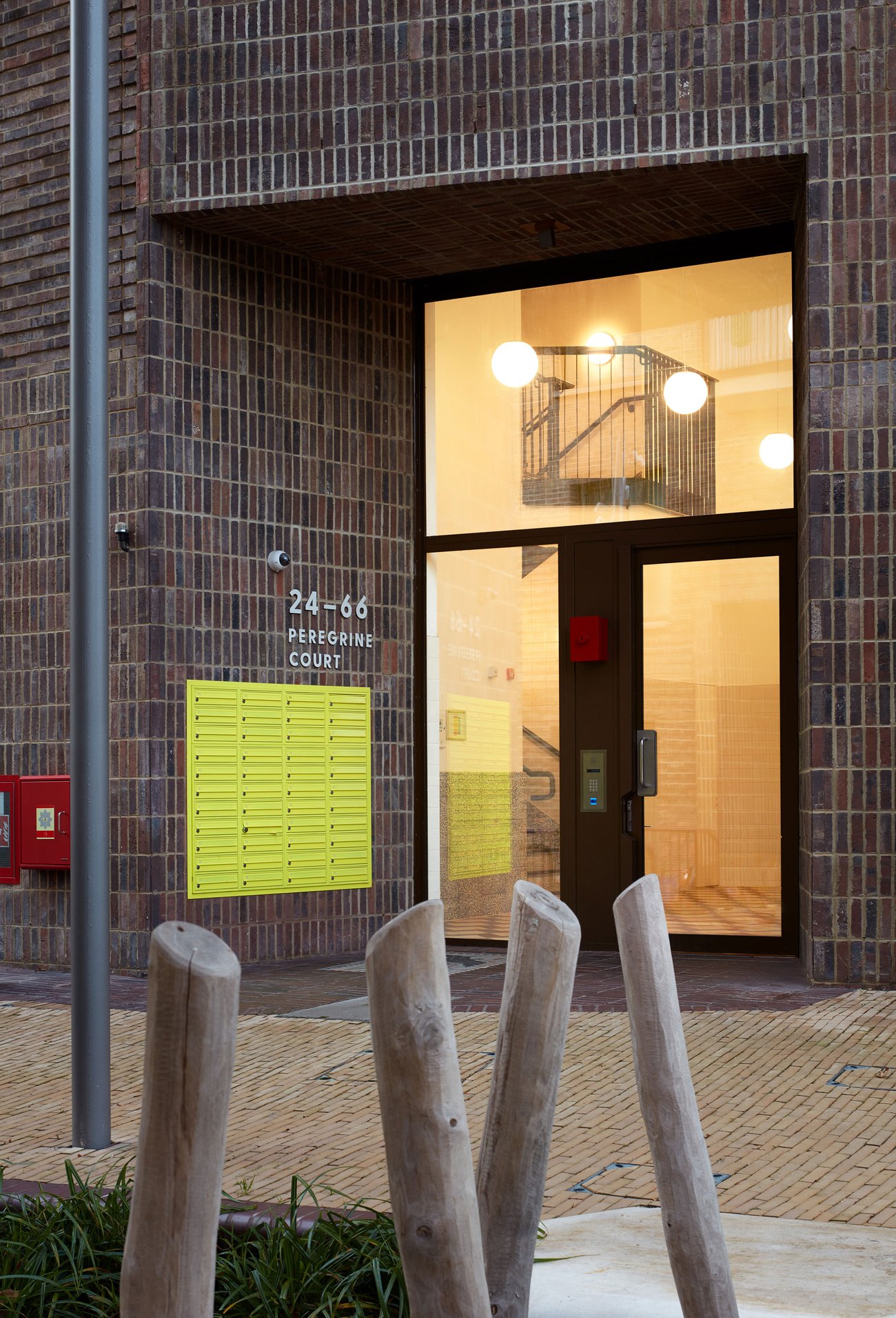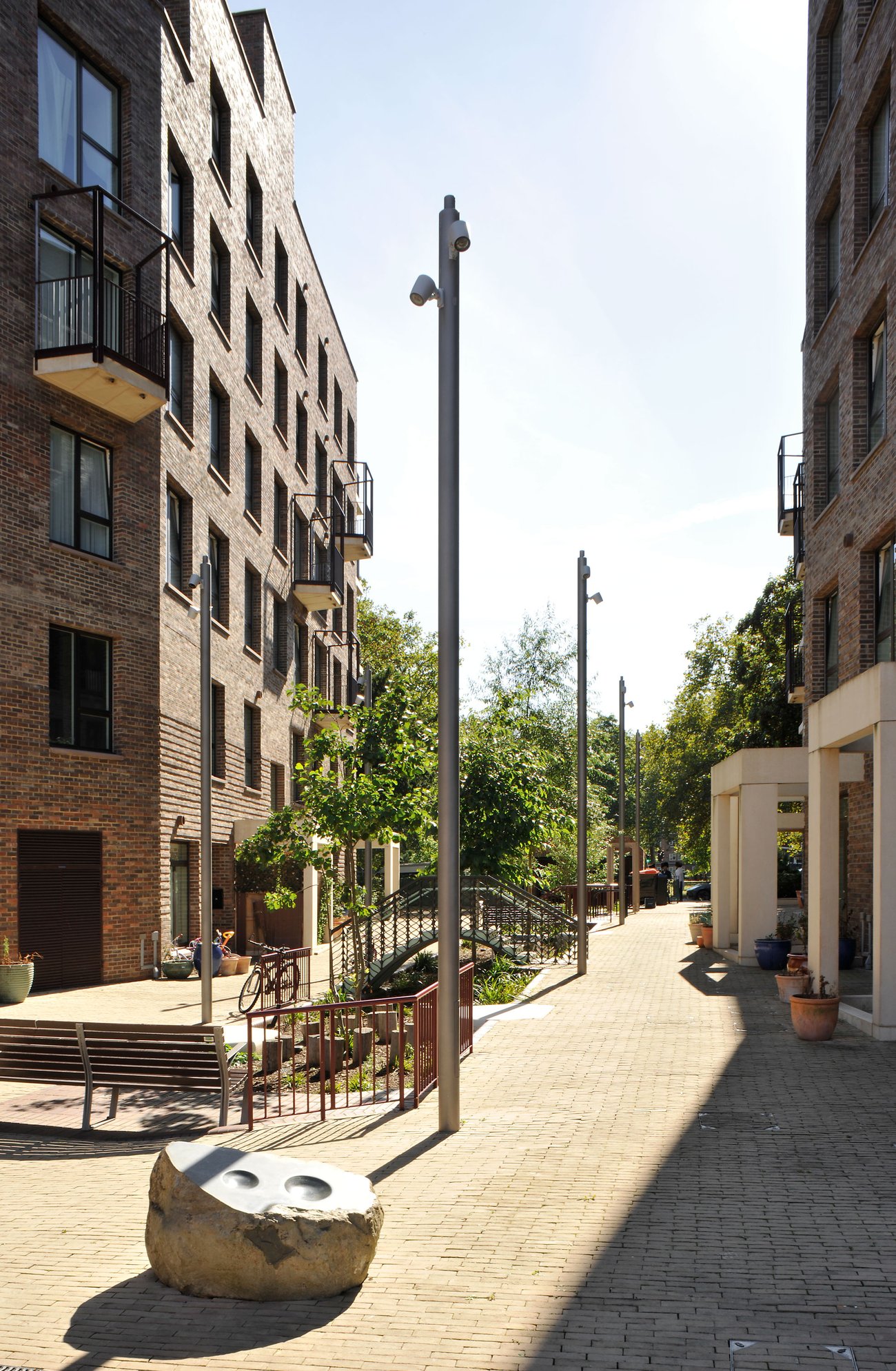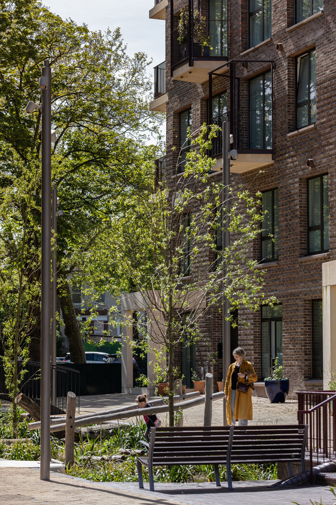 In a synthesis of architecture and landscape, buildings flex around retained mature trees and open out onto Clapton Common. The inflected geometry of the buildings improves internal qualities of daylight, views and aspect but also shapes the courtyards as comfortable, spatially interesting, outdoor rooms. The public realm, intensively shaped as a place of play and social encounter, extends into the entrance lobbies, and sets the foundations for an integrated community. It is a model for high-density family living, suitable for the changing, diverse needs of contemporary London.