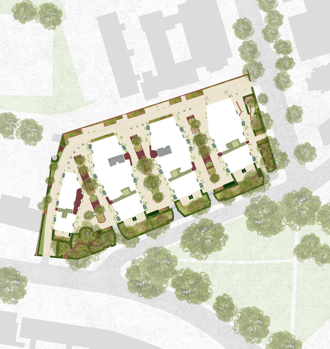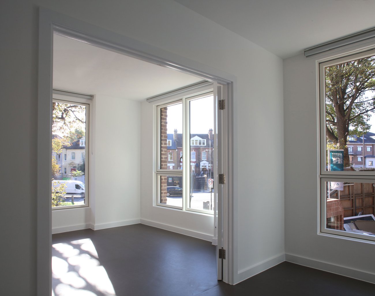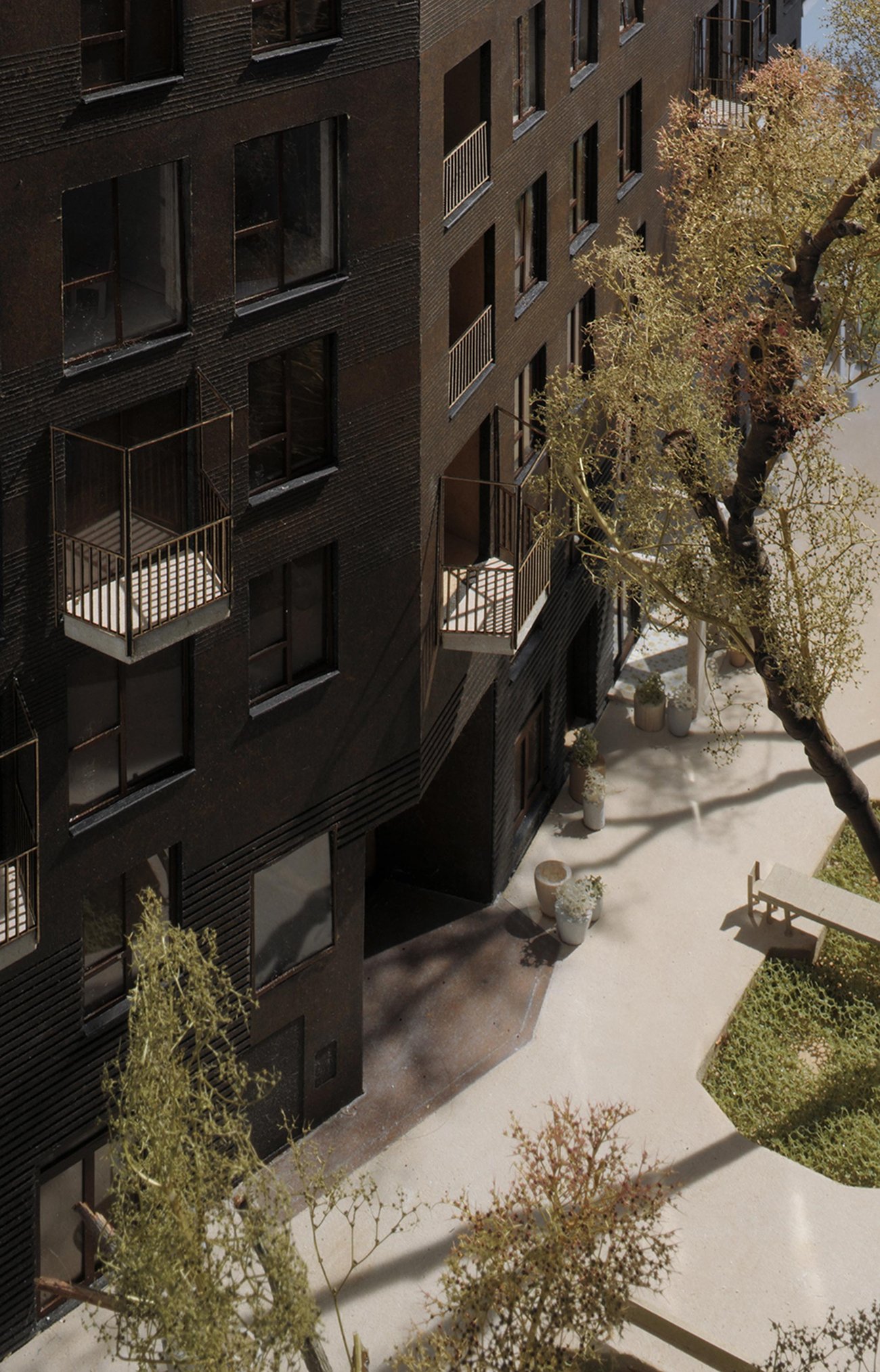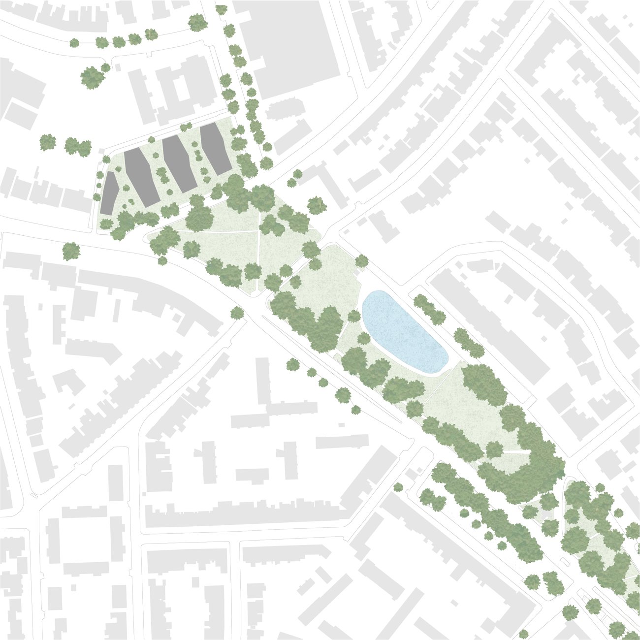 In a synthesis of architecture and landscape, buildings flex around retained mature trees and open out onto Clapton Common. The inflected geometry of the buildings improves internal qualities of daylight, views and aspect but also shapes the courtyards as comfortable, spatially interesting, outdoor rooms. The public realm, intensively shaped as a place of play and social encounter, extends into the entrance lobbies, and sets the foundations for an integrated community. It is a model for high-density family living, suitable for the changing, diverse needs of contemporary London.