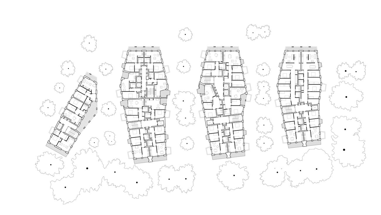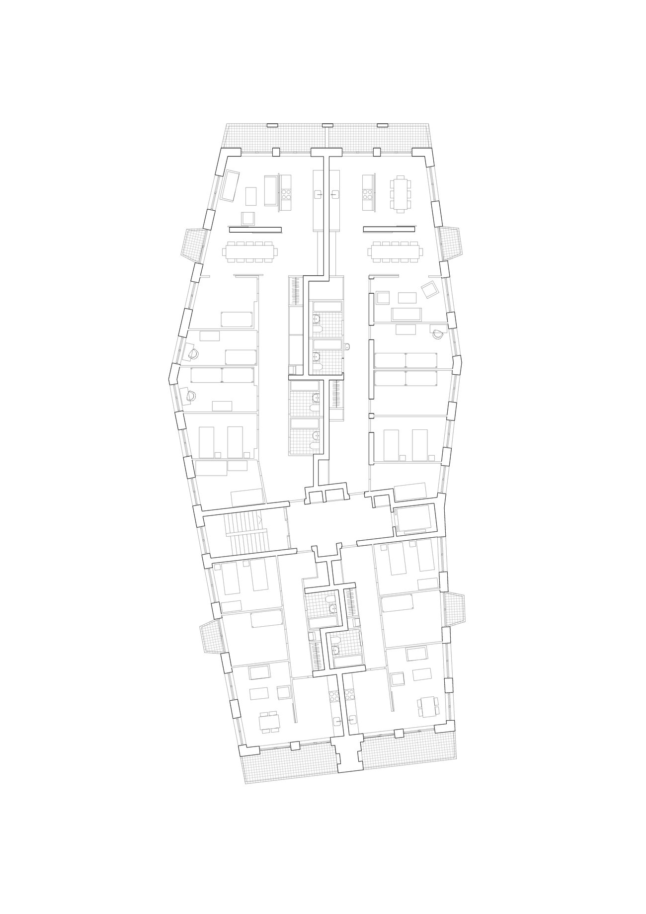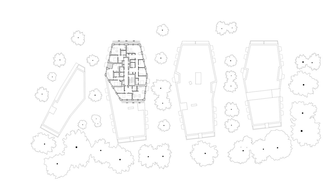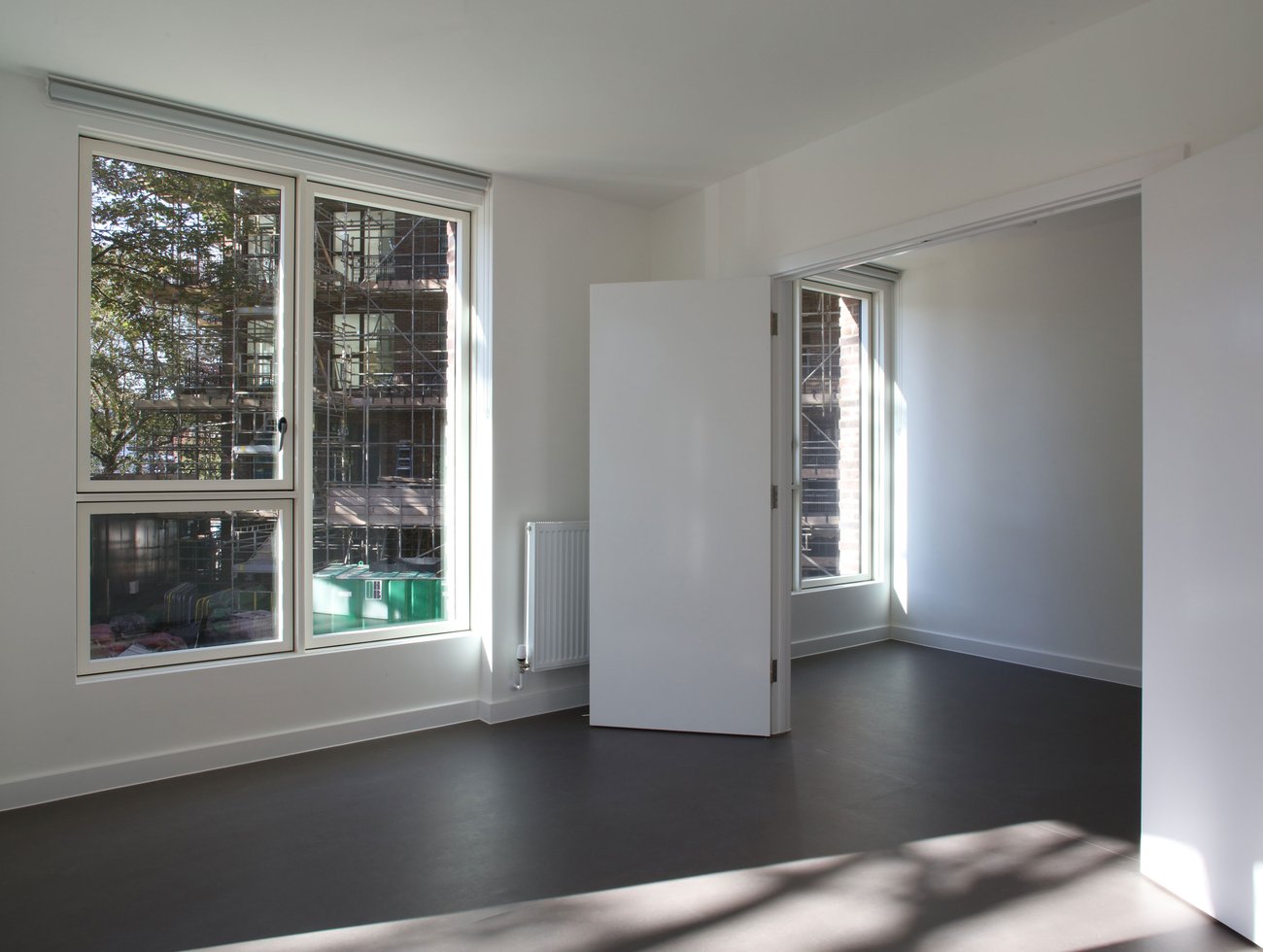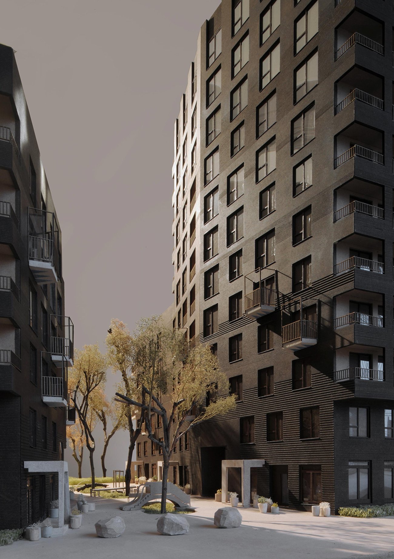 In a synthesis of architecture and landscape, buildings flex around retained mature trees and open out onto Clapton Common. The inflected geometry of the buildings improves internal qualities of daylight, views and aspect but also shapes the courtyards as comfortable, spatially interesting, outdoor rooms. The public realm, intensively shaped as a place of play and social encounter, extends into the entrance lobbies, and sets the foundations for an integrated community. It is a model for high-density family living, suitable for the changing, diverse needs of contemporary London.